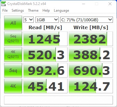 Le prestazioni del sistema sono sufficientemente buone per l'uso quotidiano. Tuttavia, le prestazioni del Core i5-11400T sono inferiori alle aspettative per i motivi già citati. Detto questo, la nostra impressione soggettiva è comunque positiva perché l'unità SSD Lexar in dotazione è sufficientemente veloce sia in lettura che in scrittura. L'elevata velocità di lettura 4K è particolarmente impressionante e consente al sistema di caricare rapidamente molti piccoli file. Il Newsmay Neosmay S2-B560TPM è rimasto nella media in PCMark 10, rimanendo indietro rispetto ai sistemi più veloci di circa 30-60 punti percentuali.