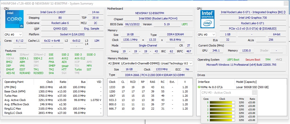 Core i5-11400Tfa parte della serie Rocket Lake-S di Intel. Nel Newsmay Neosmay S2-B560TP, si trova in un socket LGA 1200 convenzionale. Un processore "T" di questa serie ha un TDP di 35 watt (equivalente al PL1). Se la CPU non è sottoposta a throttling, può assorbire fino a 84 watt di potenza, che corrisponde al PL2. Nei computer desktop, abbiamo visto che il PL2 è spesso uguale al PL1. Tuttavia, Newsmay obbliga la CPU a rispettare i limiti del TDP attraverso il BIOS, presumibilmente per evitare il surriscaldamento. Ciononostante, riteniamo che il sistema possa permettersi di aumentare leggermente il PL1, anche sotto carico. Questi valori possono essere modificati con XTU per ottenere risultati significativamente migliori.