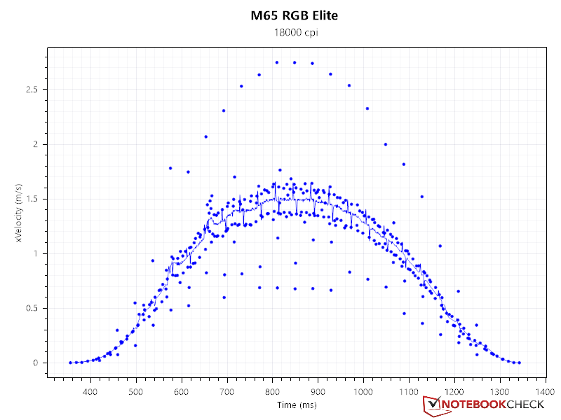 Perfect Control Speed (PCS): il PCS è la velocità massima alla quale il mouse può essere spostato senza perdere il tracciamento. Il sensore PMW3391 ha un PCS di 10,16 m/s. Il PCS massimo che siamo riusciti a raggiungere era di 3,5 m/s a 800 DPI, ma 2 m/s sembra essere un buon valore per l'M65. Il PCS non sembra variare molto tra le risoluzioni, tranne che per la velocità inferiore di 0,5 m/s a 18.000 DPI.