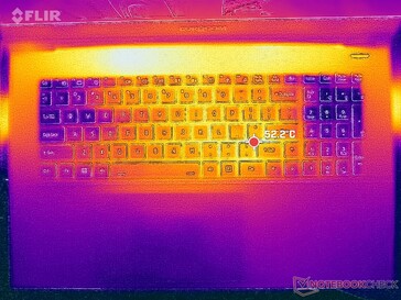 I punti caldi della temperatura superficiale sono sensibilmente più caldi rispetto ad altri computer portatili da gioco. In particolare, alcune aree della tastiera possono essere calde fino a 53 C durante il gioco, rispetto ai soli 37 C o 40 C di MSI GE78HX o Asus TUF Gaming A17.