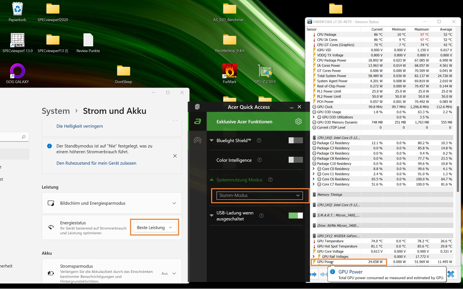 Allo stesso tempo, la modalità Performance di Acer non porta inaspettatamente ad alcun guadagno in termini di prestazioni, e anche la modalità "Migliori prestazioni" di Windows non cambia nulla.