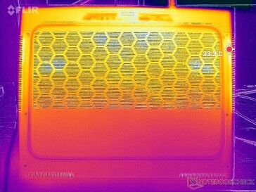 Le temperature di superficie possono essere molto calde a causa del design sottile del profilo. I punti caldi possono raggiungere circa 50 C sulla parte superiore e inferiore, rispetto ai 40 C del Blade 16. Per fortuna, questi punti caldi si trovano verso la parte posteriore e lontano dai poggiapolsi. Fortunatamente, questi punti caldi si trovano verso la parte posteriore e lontano dai poggiapolsi.