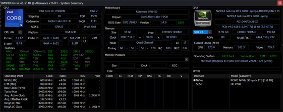 | Alienware x16 R1 i9-13900HK, GeForce RTX 4080 Laptop GPU, SK hynix PC801 HFS001TEJ9X101N, IPS, 2560x1600, 16" | Lenovo Legion Pro 7 RTX4090 i9-13900HX, GeForce RTX 4090 Laptop GPU, Samsung PM9A1 MZVL21T0HCLR, IPS, 2560x1600, 16" | Asus ROG Zephyrus M16 GU604VY-NM042X i9-13900H, GeForce RTX 4090 Laptop GPU, Samsung PM9A1 MZVL22T0HBLB, IPS, 2560x1600, 16" | Razer Blade 16 Early 2023 i9-13950HX, GeForce RTX 4080 Laptop GPU, SSSTC CA6-8D1024, IPS, 2560x1600, 16" | Dell G16 7620 i7-12700H, GeForce RTX 3060 Laptop GPU, WDC PC SN810 512GB, IPS, 2560x1600, 16" | Alienware m17 R5 (R9 6900HX, RX 6850M XT) R9 6900HX, Radeon RX 6850M XT, SSSTC CA6-8D1024, IPS, 3840x2160, 17" | |