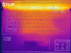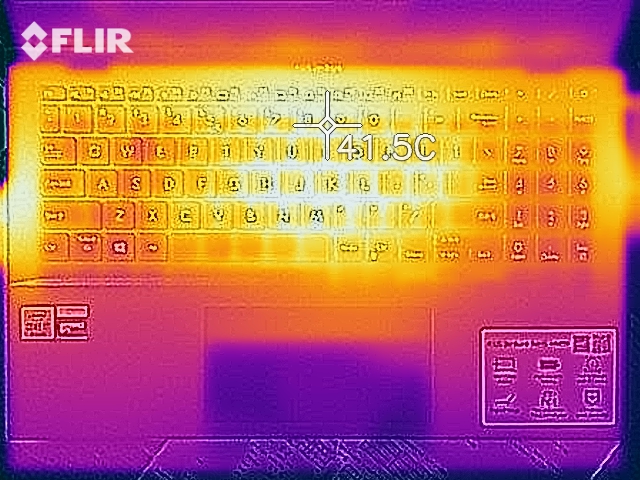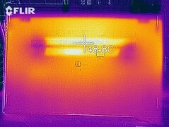 Tutto rimane fresco nell'uso inattivo, e lo stesso vale per i poggiapolsi in ogni situazione, anche sotto stress. Un massimo di 44 °C (~111 °F) è raggiunto sotto carico pesante, il punto caldo si trova sul lato inferiore al centro verso il display. Questo è comunqie un valore abbastanza buono in considerazione delle temperature più fredde circostanti; ad eccezione del fratello gemello tutti i concorrenti diventano più caldi sotto carico e a volte in modo significativo.