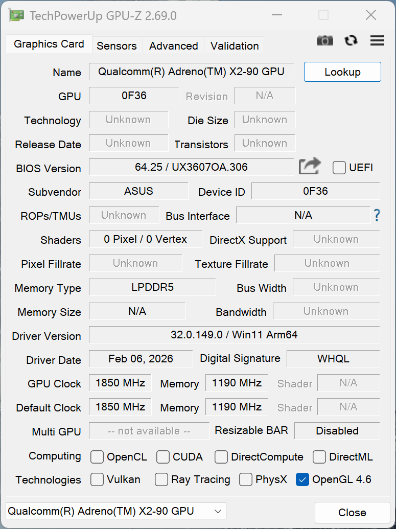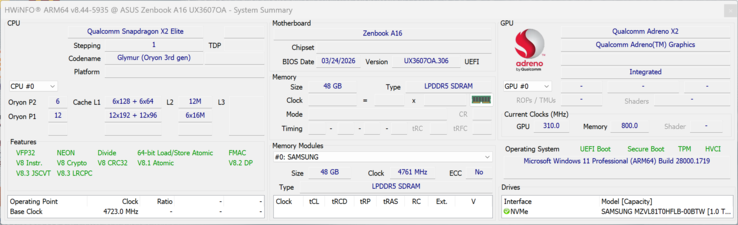 | Asus Zenbook A16 UX3607 Qualcomm Snapdragon X2 Elite Extreme X2E-94-100 ⎘ Qualcomm Adreno X2-90 ⎘ 48 GB Memoria, 1000 GB SSD | 1.2 kg | 16.5 mm | 16.00" 2880x1800 212 PPI OLED | ||