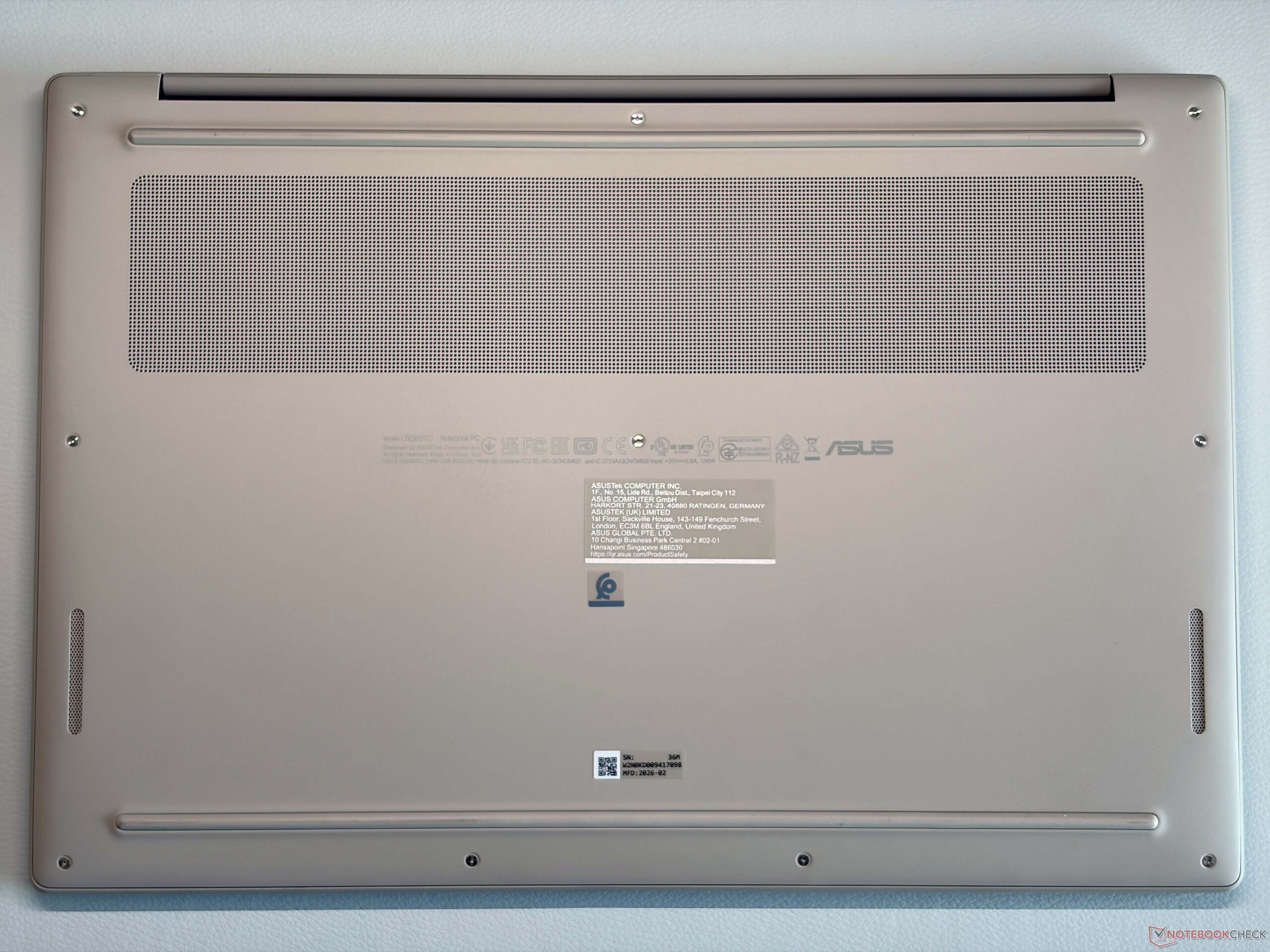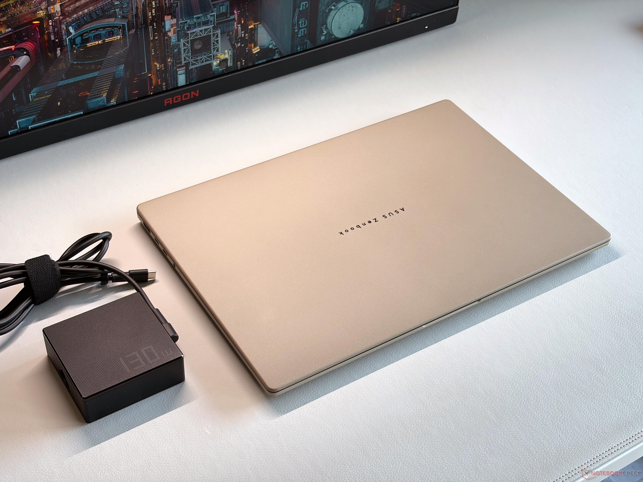 Il peso inferiore dello Zenbook A16 è evidente rispetto ai rivali e persino il più piccolo MacBook Air da 15 pollici è più pesante di 300 grammi. L'alimentatore da 130W incluso fa salire la bilancia a 469 grammi.
