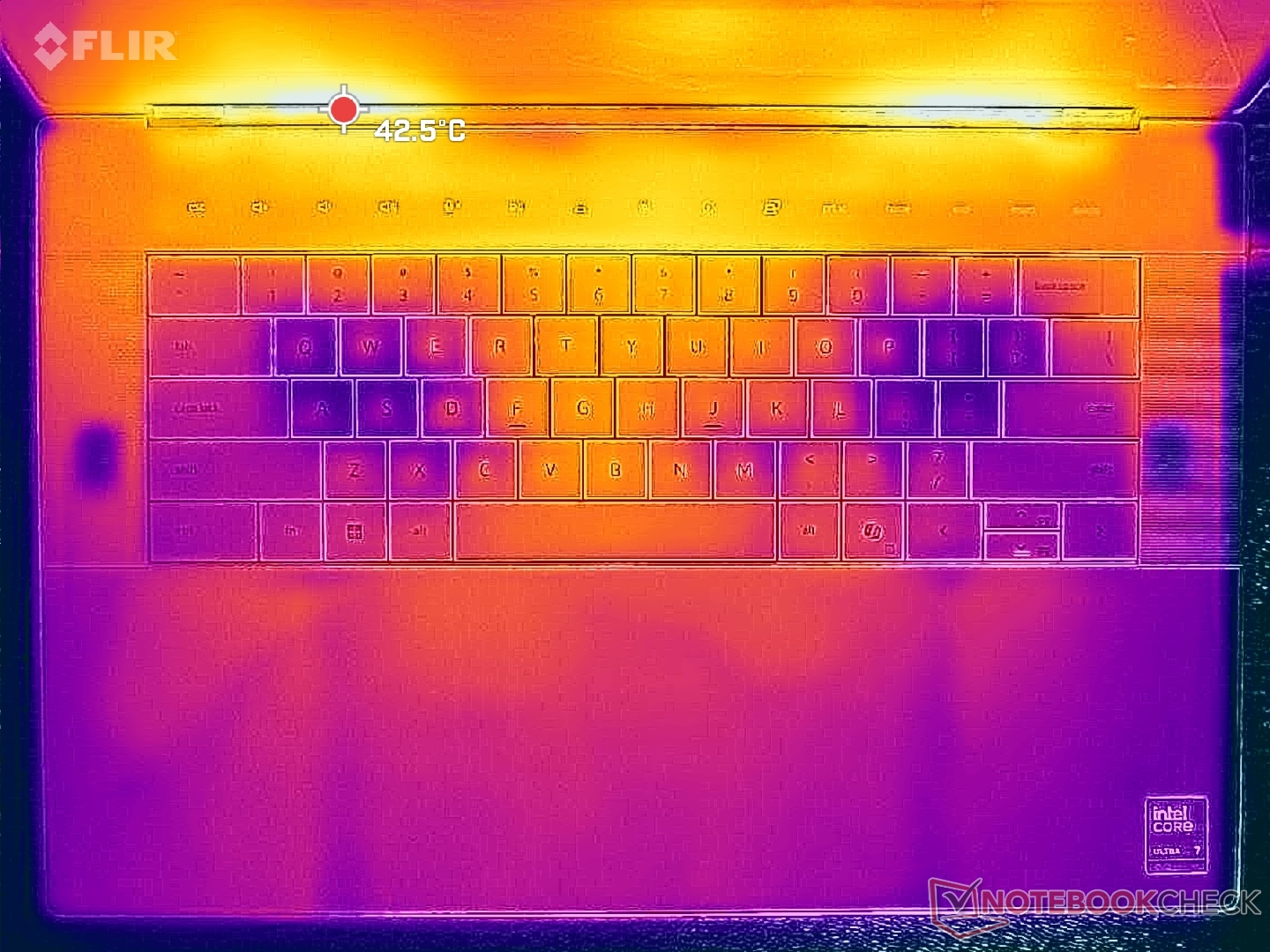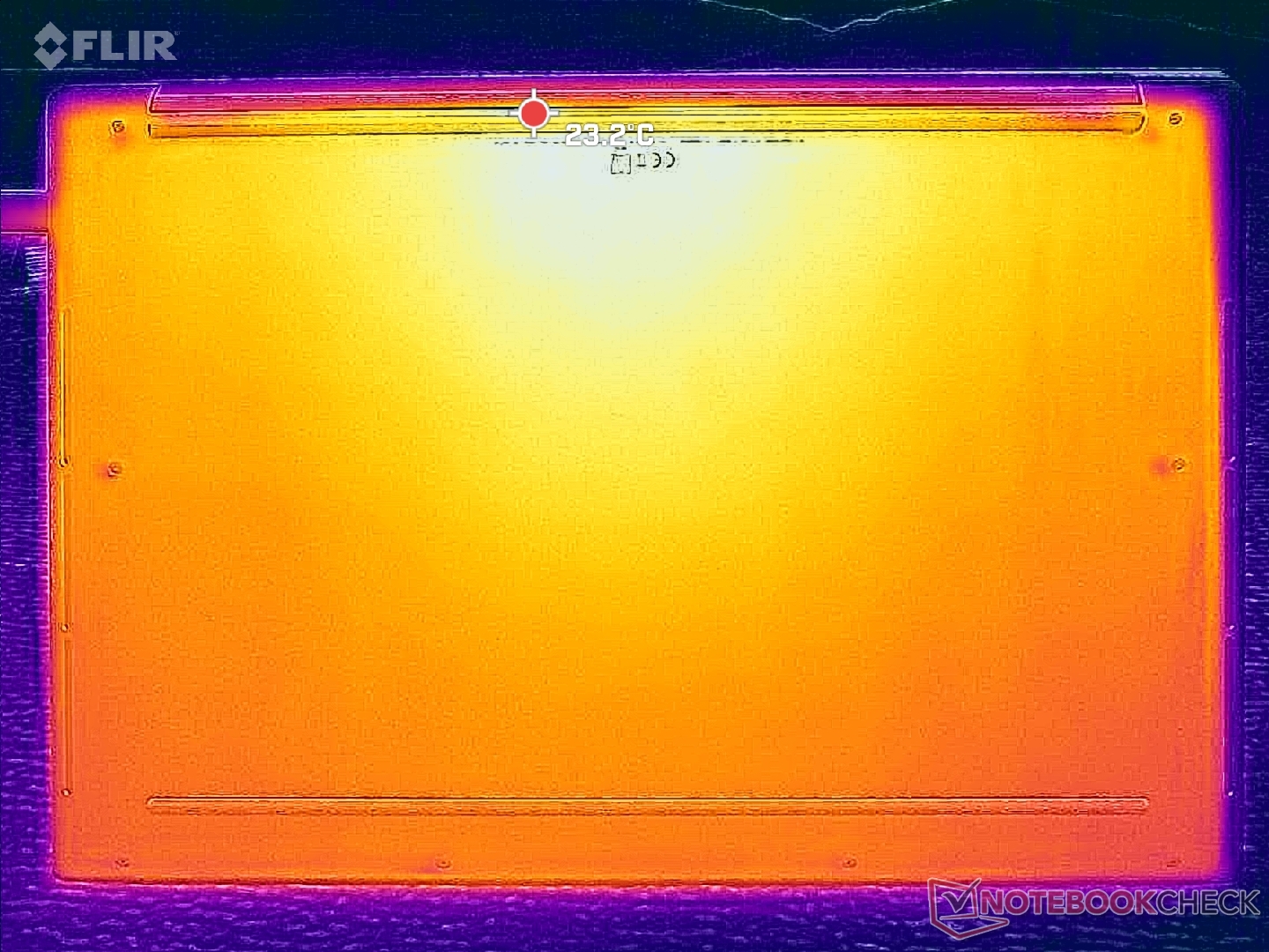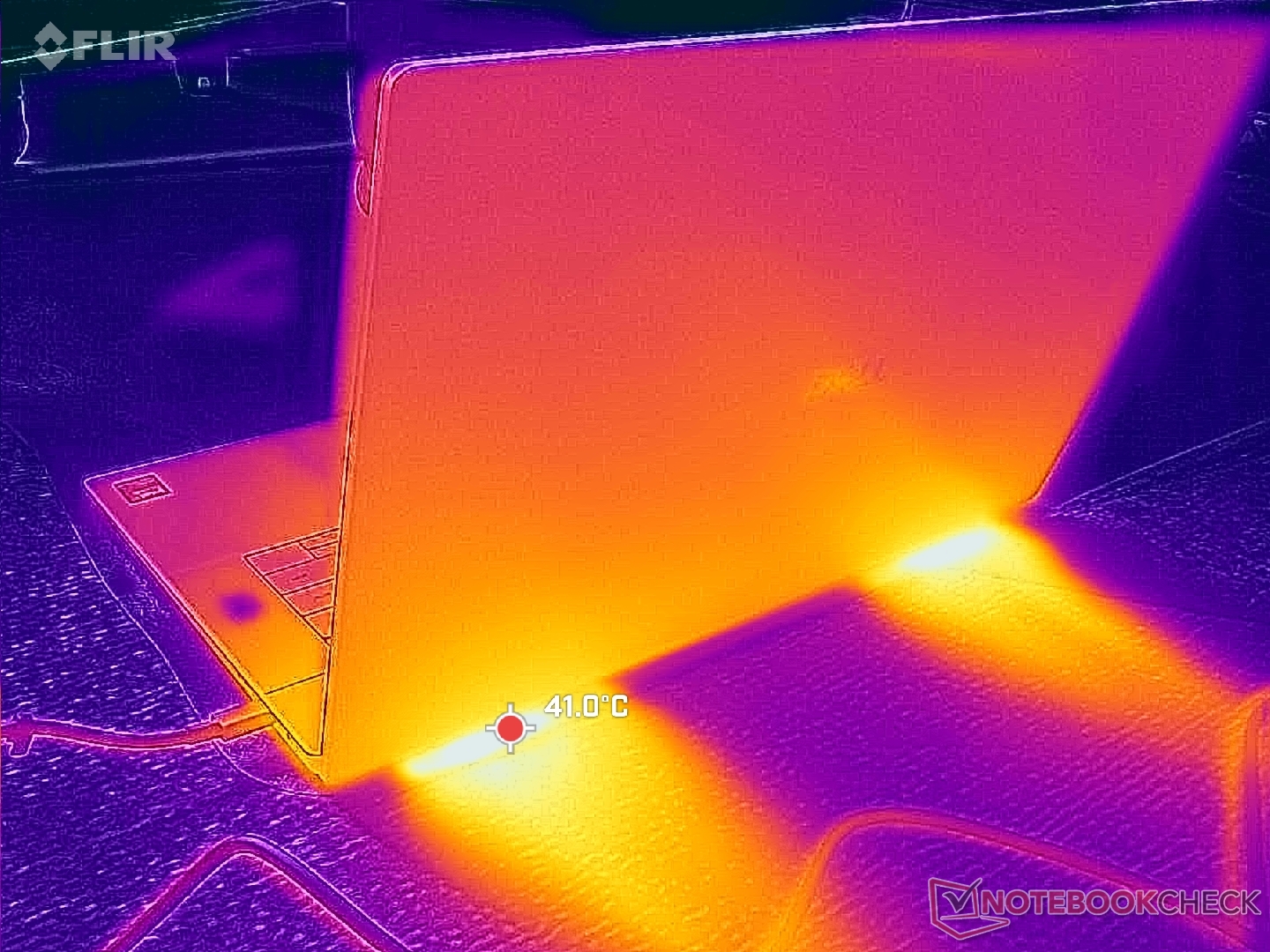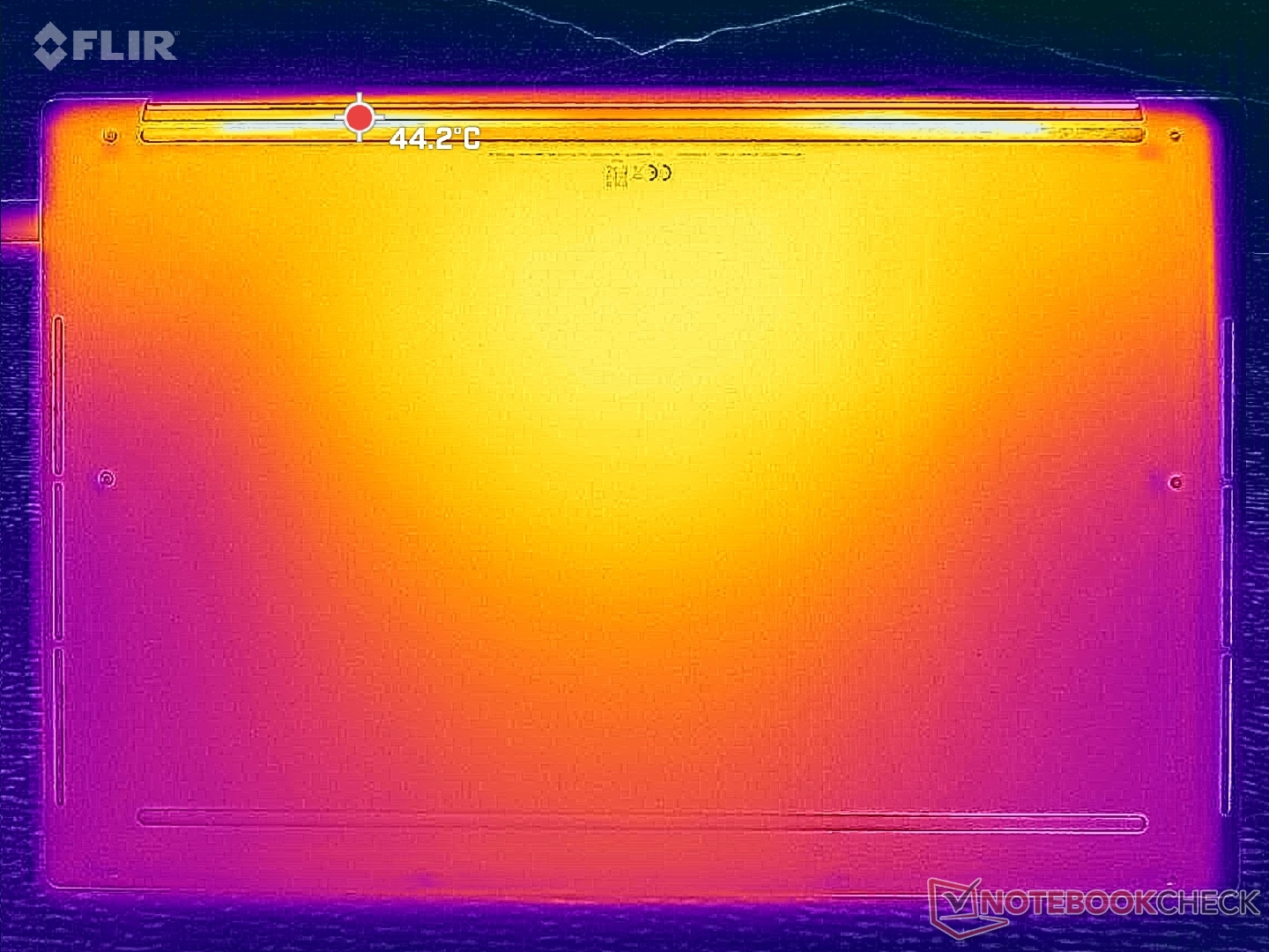 I punti caldi sul coperchio inferiore, vicino alle bocchette, possono raggiungere quasi 45 C quando si eseguono carichi impegnativi. Non possiamo fare a meno di chiederci se ulteriori fori di ventilazione avrebbero migliorato le temperature complessive, ma Dell sta chiaramente privilegiando un design visivo più pulito e privo di prese d'aria, come la serie MacBook.