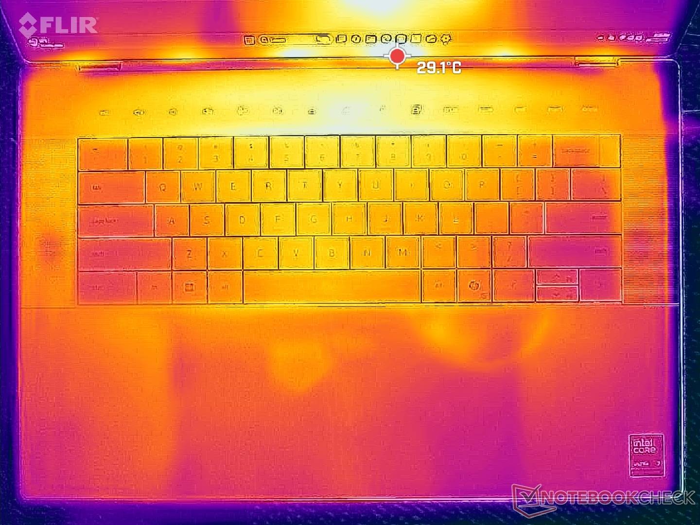 (+) In idle, la temperatura media del lato superiore è di 28.7 °C / 84 F, rispetto alla media deld ispositivo di 31.3 °C / 88 F.