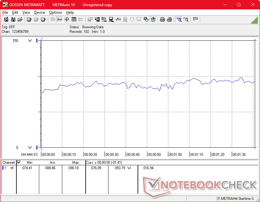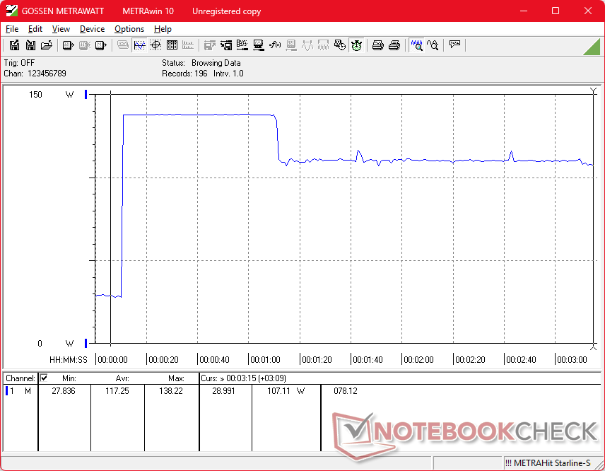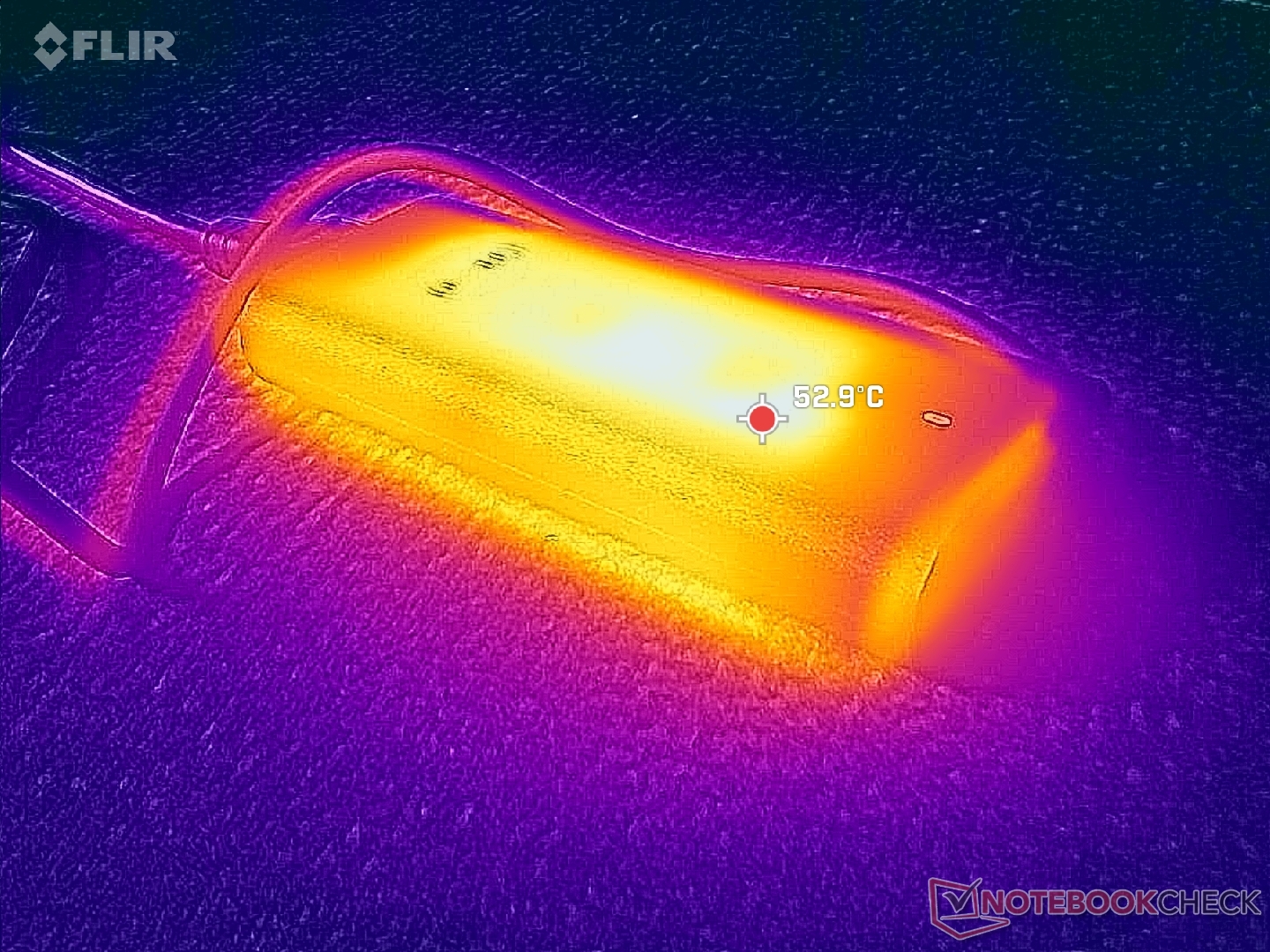 Il funzionamento al minimo sul desktop può assorbire fino a 6 W in modalità Risparmio energetico con l'iGPU attiva o fino a 33 W in modalità Prestazioni con la dGPU attiva e lo schermo OLED che visualizza prevalentemente colori bianchi (ad esempio durante la navigazione). Il consumo quando si eseguono carichi più impegnativi è altrimenti simile al modello dello scorso anno, se non leggermente inferiore per una migliore prestazione per watt, soprattutto perché Dell 16 Premium viene fornito con lo stesso adattatore CA USB-C da 130 W (~12,8 x 5,5 x 2,3 cm) di prima.