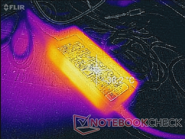 I punti caldi sono concentrati verso la parte posteriore del sistema dove sono posizionati il processore e la sua soluzione di raffreddamento. Le temperature possono raggiungere fino a 38 C e 57 C sulla parte superiore e inferiore del portatile, rispettivamente, rispetto ai soli 31 C e 43 C del Lenovo IdeaPad 3 15. Il poggiapolsi e la maggior parte della tastiera saranno sempre molto più freschi per un uso confortevole a prescindere dal carico.
