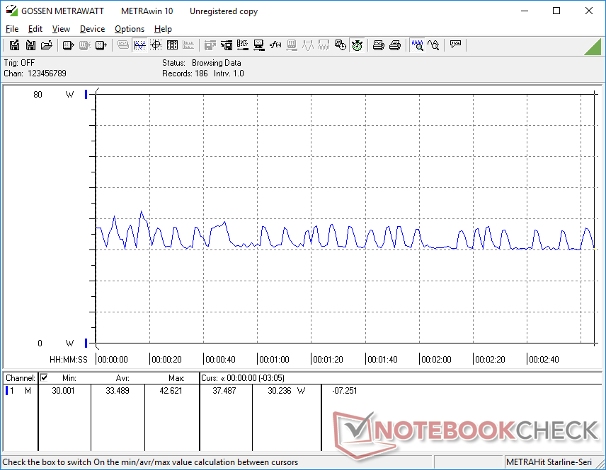 L'inattività sul desktop disegna tra i 3 W e i 7 W per essere più efficiente del previsto rispetto ad altri portatili da 15.6 pollici che girano con CPU della serie U. È interessante notare che il consumo di energia non è costante quando si esegue Witcher 3il sistema si muove tra i 30 W e i 42 W anche se i frame rate sembrano essere costanti