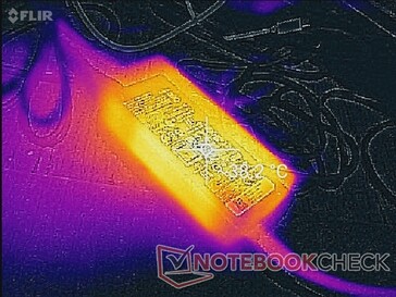 Siamo in grado di registrare un massimo di 56 W dal piccolo (~10,6 x 4,5 x 2,8 cm) adattatore AC da 65 W quando si eseguono carichi estremi dove la CPU raggiunge il 100% di utilizzo. Questo prelievo è solo temporaneo, come mostrato dal nostro grafico qui sotto.