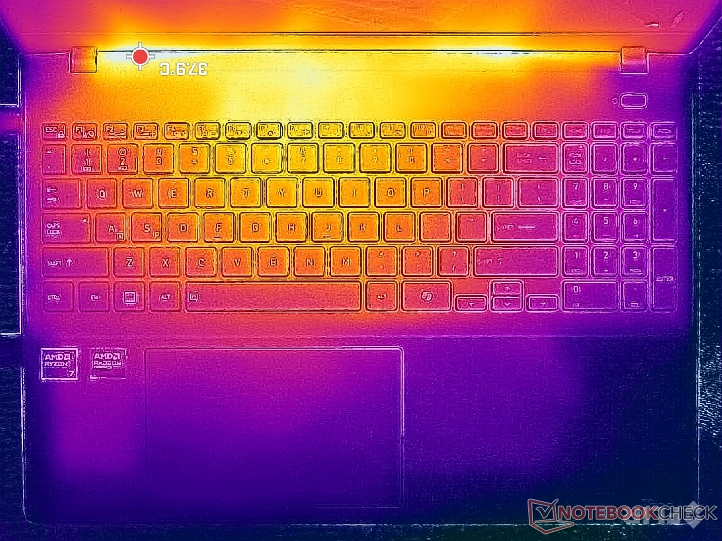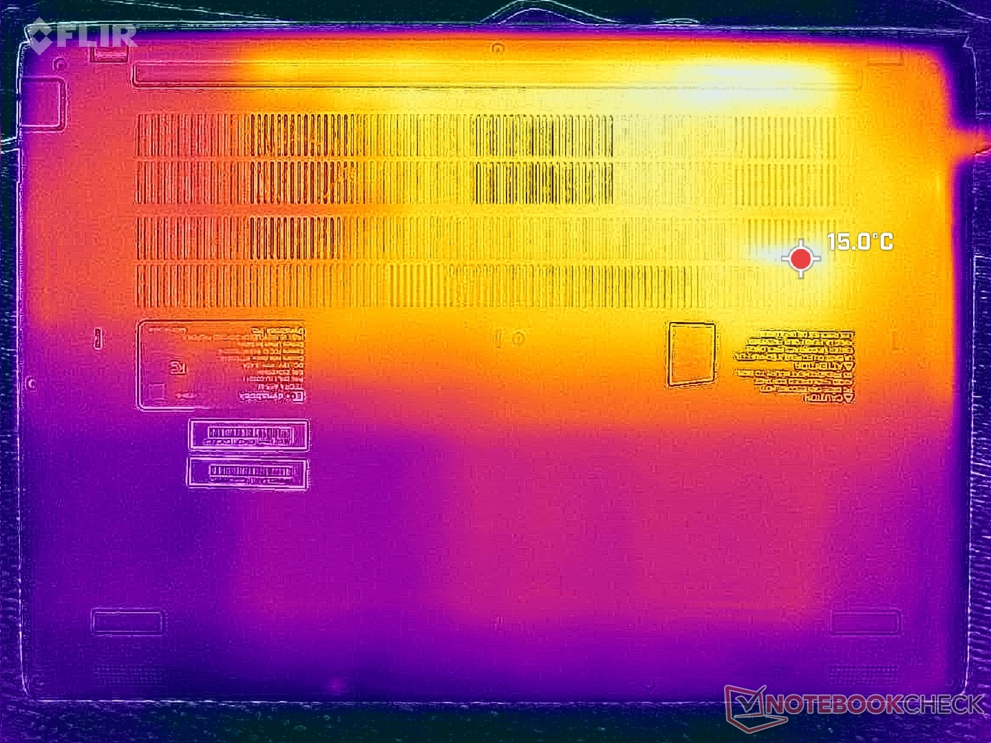 Le temperature di superficie superano a malapena i 40 C quando si eseguono carichi estremi per periodi prolungati, dato che il fattore di forma da 16 pollici è piuttosto grande per quella che è essenzialmente una CPU Ryzen serie U.