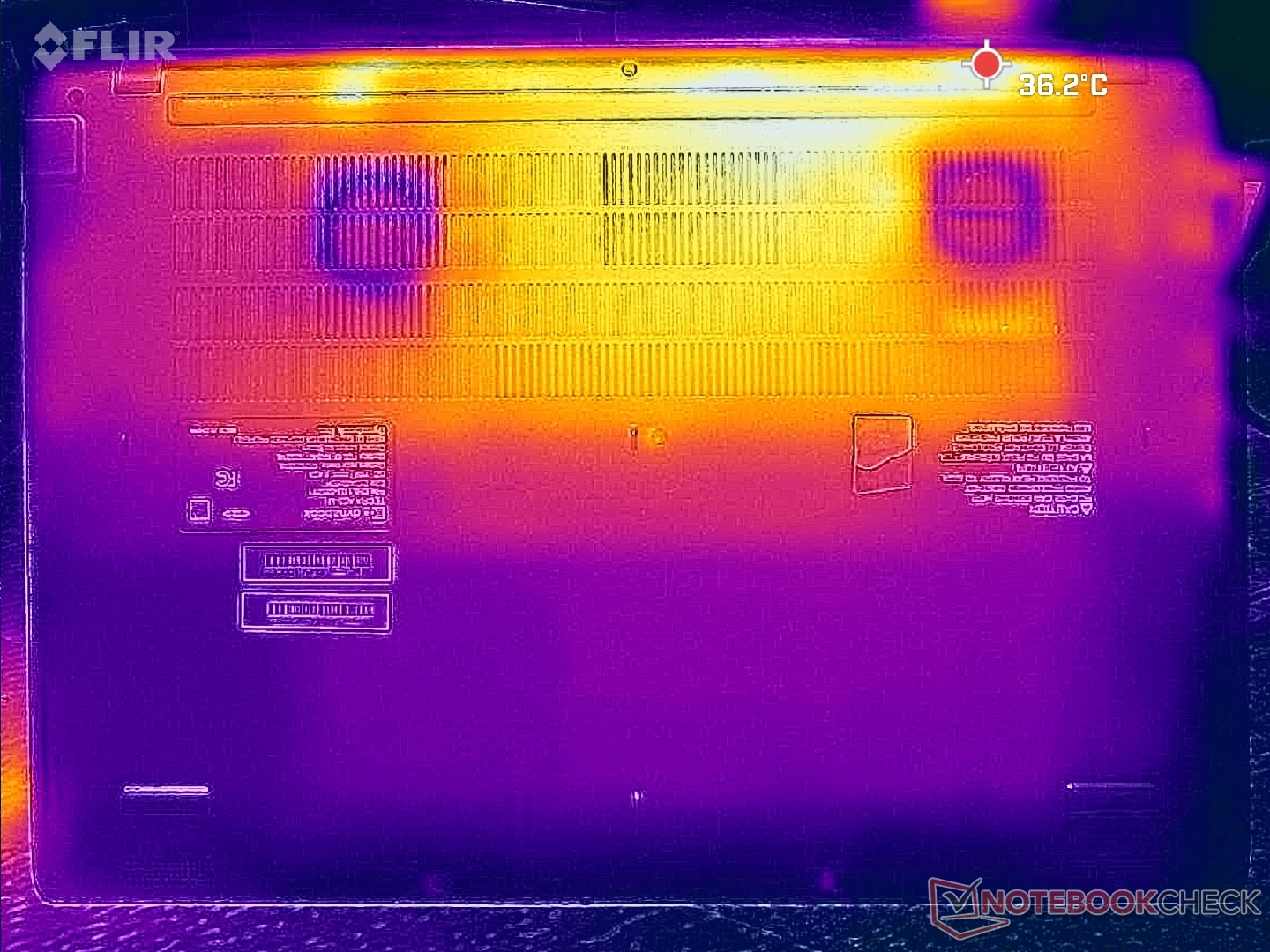 (+) La temperatura massima sul lato superiore è di 35.8 °C / 96 F, rispetto alla media di 34.3 °C / 94 F, che varia da 21.2 a 62.5 °C per questa classe Office.
