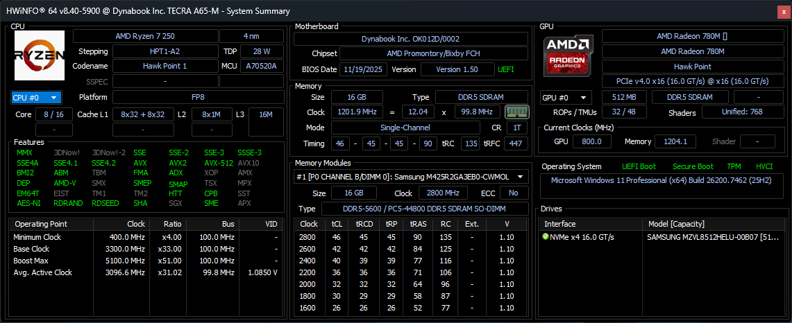| Dynabook Tecra A60 A65-M R7 250, Radeon 780M, Samsung PM9C1 MZVL8512HELU, IPS, 1920x1200, 16" | LG Gram Pro 16Z90TS-G.AU89G Core Ultra 7 256V, Arc 140V, Samsung PM9A1a MZVL21T0HDLU, IPS, 2560x1600, 16" | Lenovo ThinkPad T16 Gen 4 21QQS06M00 Ryzen AI 7 PRO 350, Radeon 860M, SK hynix PC801 HFS001TEJ9X162N, IPS, 1920x1200, 16" | HP EliteBook 8 G1a 16 AI Ryzen AI 7 PRO 350, Radeon 860M, Micron 3500 MTFDKBA512TGD, IPS, 1920x1200, 16" | Dell 16 Premium DA16250 Ultra 7 255H, GeForce RTX 5070 Laptop, Kioxia BG6 KBG6AZNV1T02, OLED, 3840x2400, 16.3" | Asus ExpertBook B5 B5605CCA Ultra 5 225H, Arc 130T, Micron 2500 MTFDKBA512QGN, IPS, 2560x1600, 16" | |