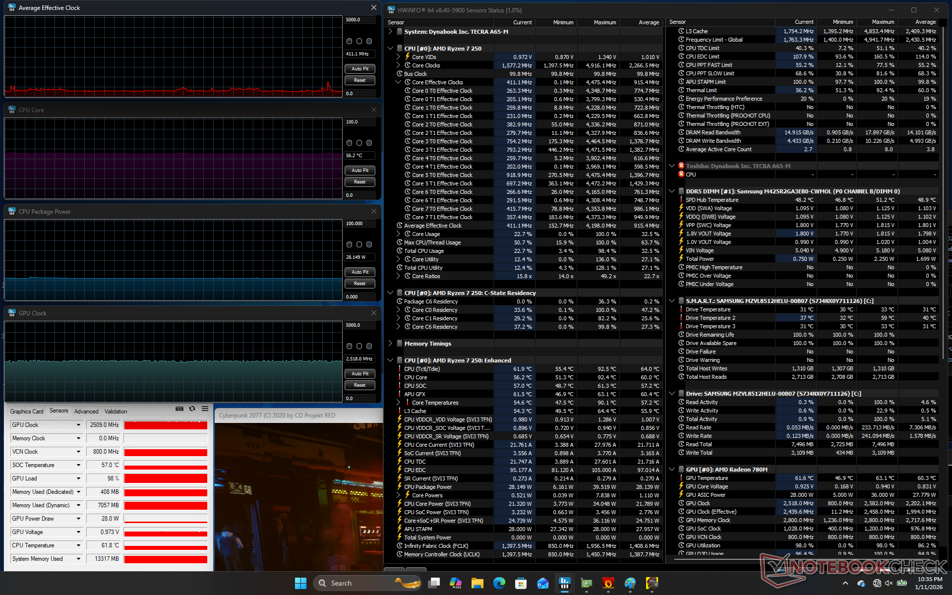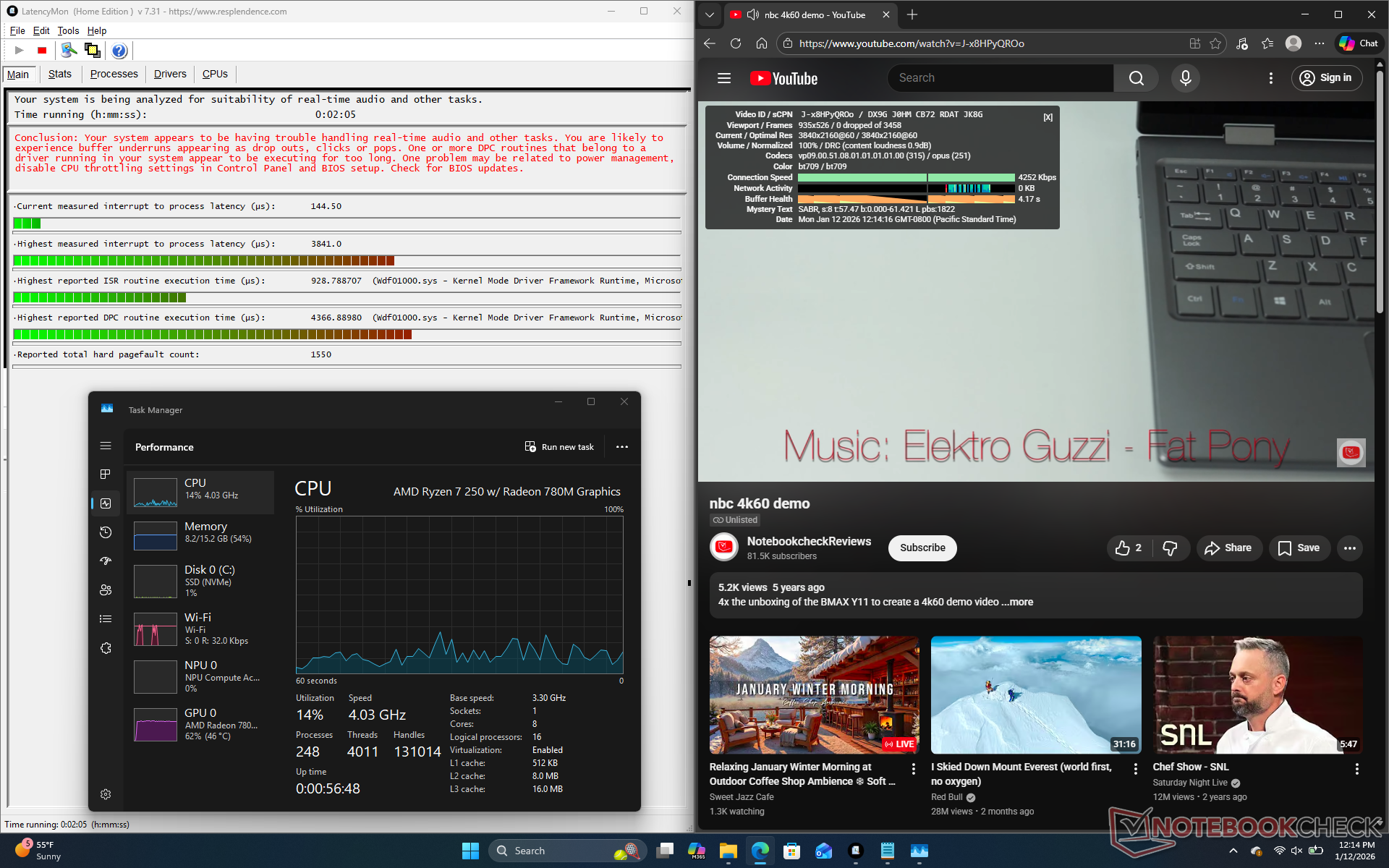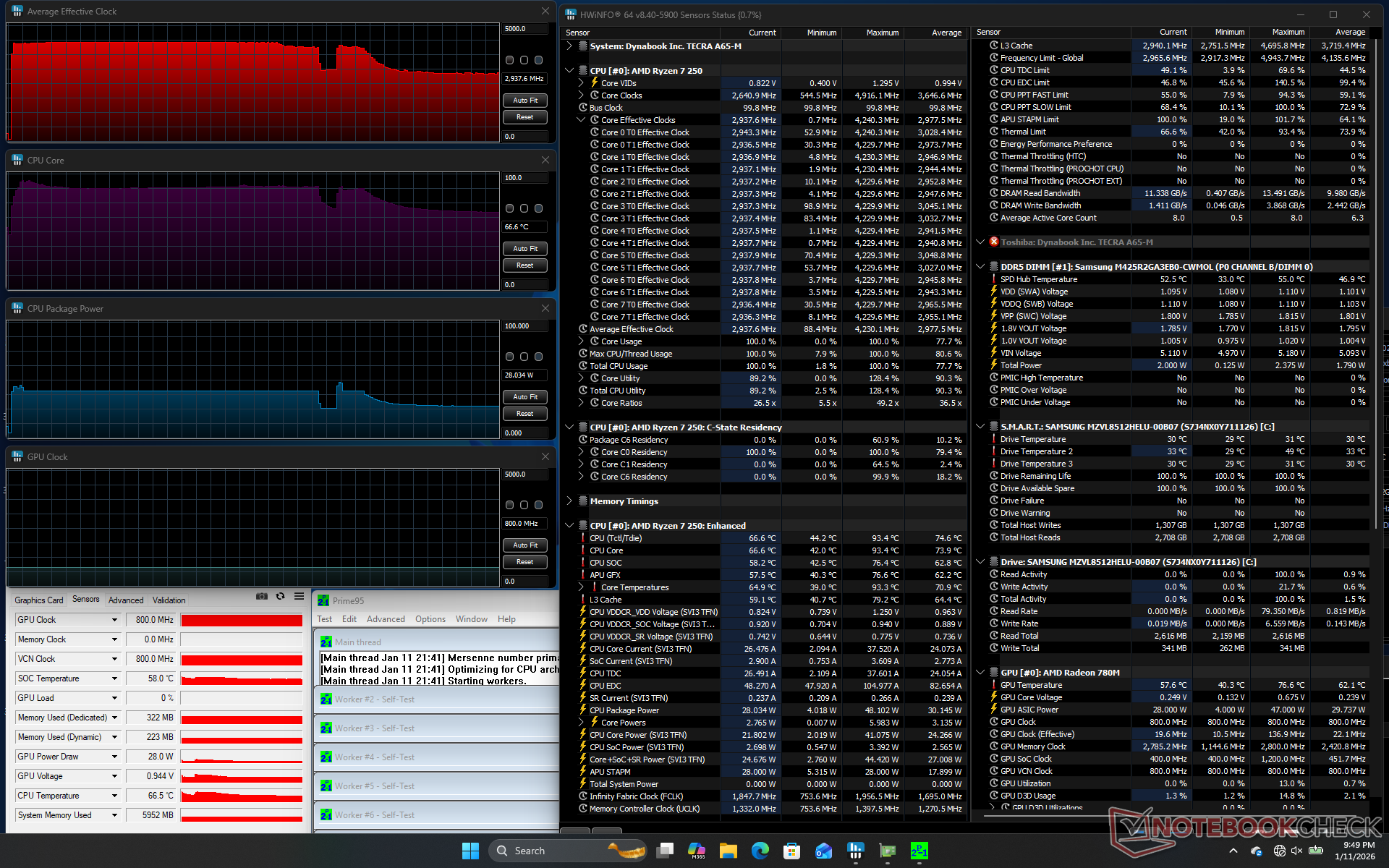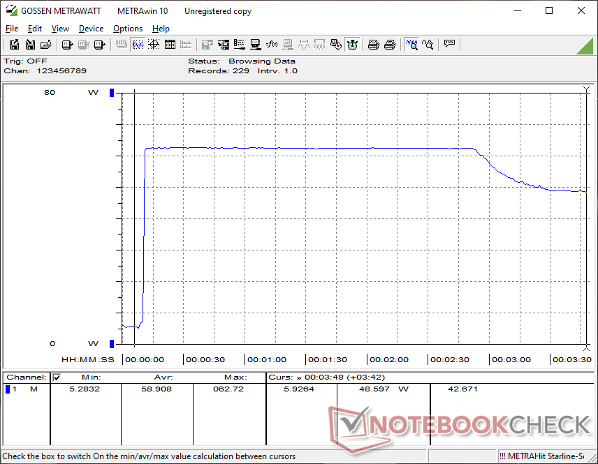 La CPU ha raggiunto i 4,2 GHz, 41 W e 87 C per i primi due minuti, prima di scendere e stabilizzarsi a 3 GHz, 28 W e 67 C. Il processore è rimasto relativamente fresco, sotto i 70 C, rispetto ai 75 C del modello con processore Intel Asus ExpertBook B5.