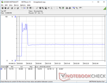 Siamo riusciti a registrare un consumo massimo di 87 W dal piccolo (~12,5 x 4,8 x 3 cm) adattatore CA da 90 W quando la CPU è al 100 percento di utilizzo. Questa richiesta è solo temporanea, prima che intervenga il throttling, come mostrano i nostri grafici di consumo energetico qui sotto.
