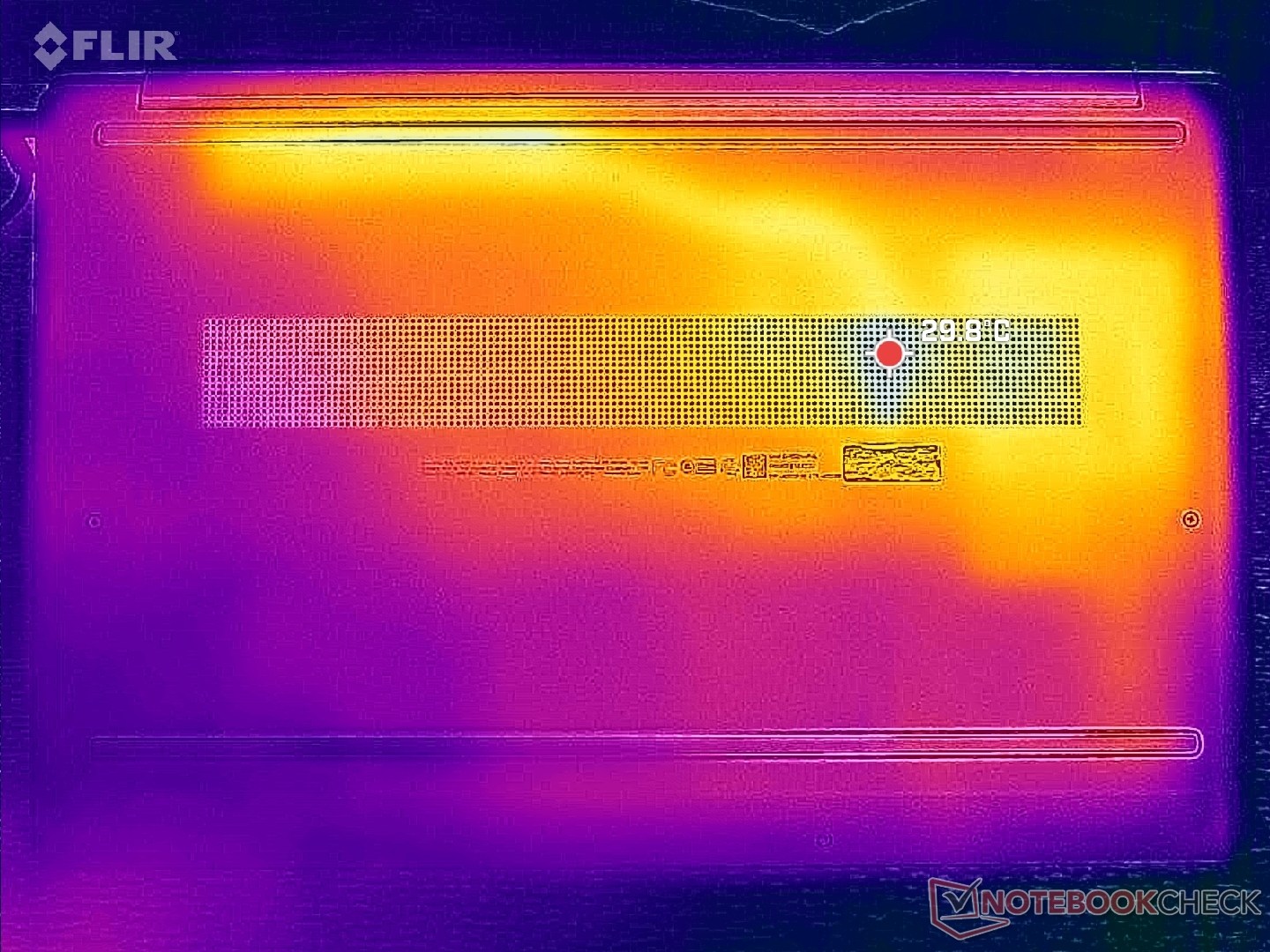 (+) In idle, la temperatura media del lato superiore è di 28.7 °C / 84 F, rispetto alla media deld ispositivo di 31.3 °C / 88 F.