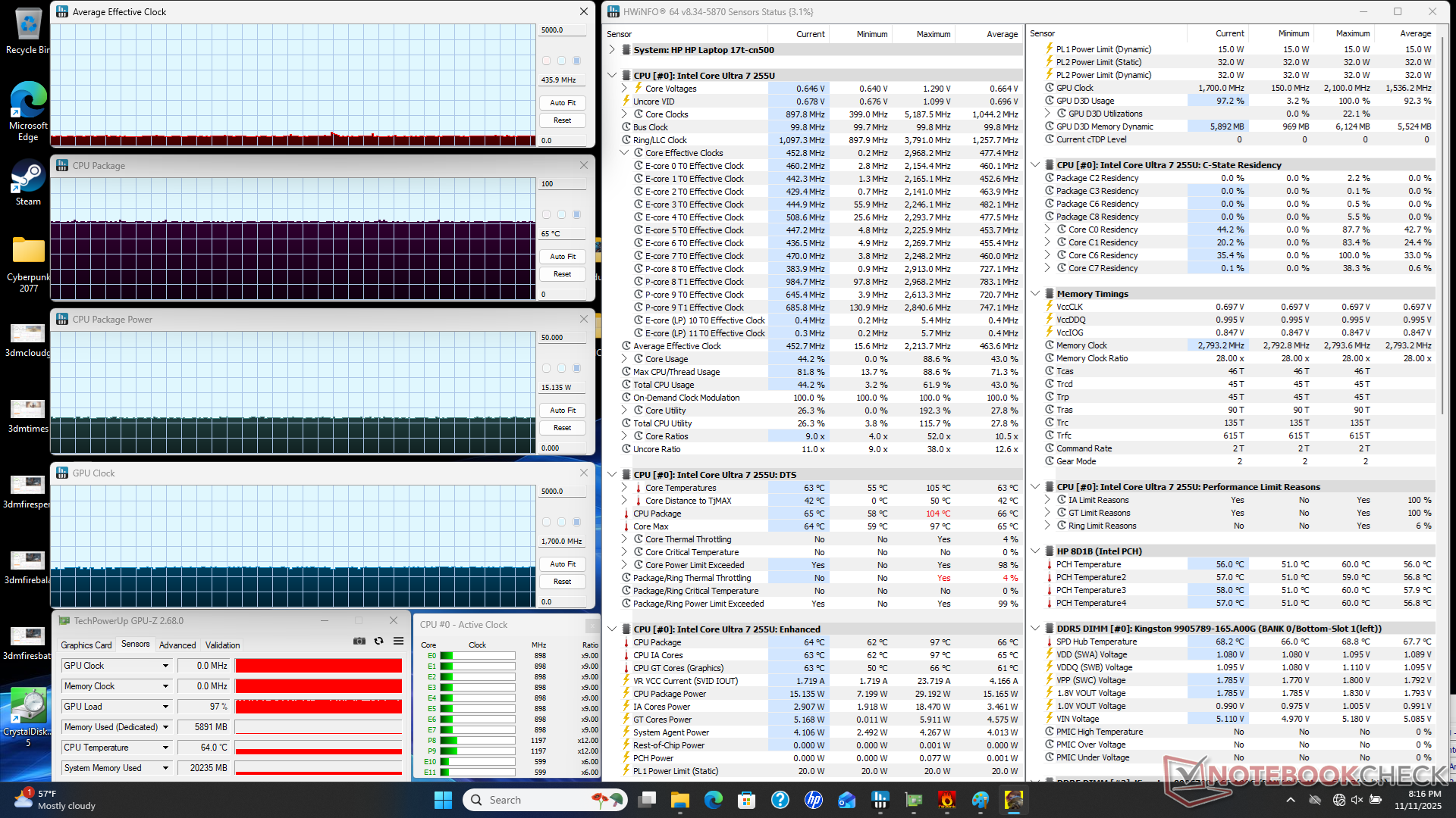 | Clock medio della CPU (GHz) | Clock della GPU (MHz) | Temperatura media della CPU (°C) | ||