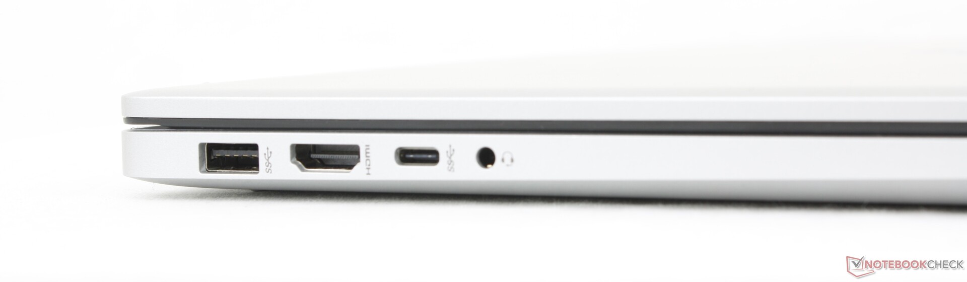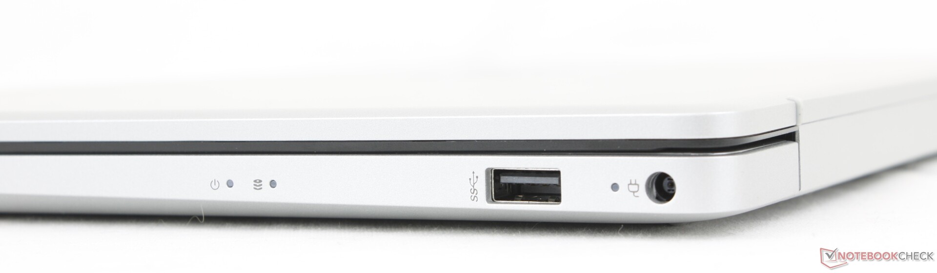 Le opzioni delle porte sono identiche a quelle del Lenovo V17 ma senza il lettore di schede SD integrato. L'unica porta USB-C supporta monitor esterni e la ricarica con adattatori CA USB-C di terze parti, nel caso in cui i proprietari dovessero perdere l'adattatore CA a botte.