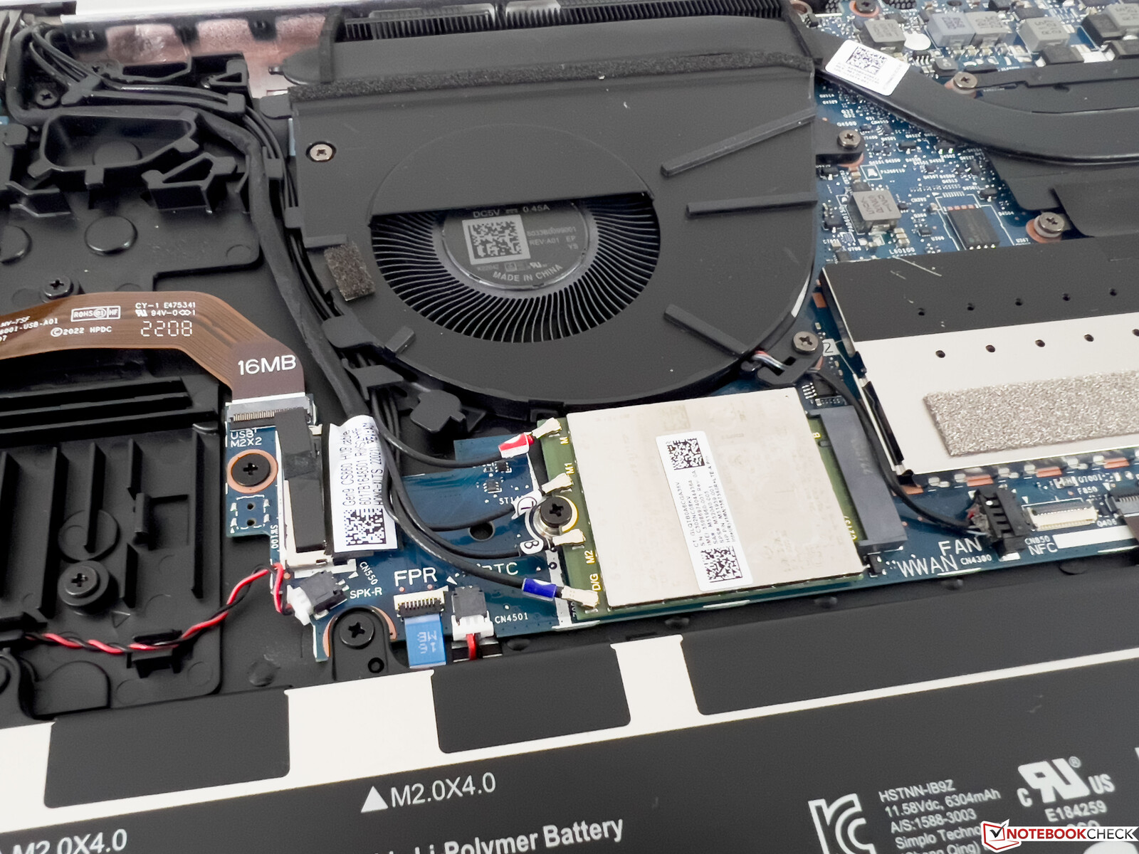 Il coperchio inferiore dell'unità base è facile da rimuovere, a differenza delloZBook Studio 16questo dispositivo non ha viti nascoste. Le opzioni di manutenzione sono buone. Oltre agli slot per il modulo RAM e per l'unità SSD M.2 2280 (ciascuno nascosto sotto un ulteriore coperchio), gli utenti possono sostituire sia il modulo Wi-Fi che quello WWAN.