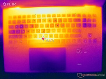 Le temperature superficiali sono molto più basse sul piano tastiera rispetto al piano inferiore. I punti caldi sulla parte superiore raggiungono circa 40 C quando si gioca, rispetto agli oltre 50 C della parte inferiore. Il Omen 16 con processore Intel può essere ancora più caldo, fino a 60 C in condizioni simili. Questi punti caldi si trovano verso la parte posteriore dello chassis, dove è improbabile che le dita e i palmi delle mani entrino in contatto.