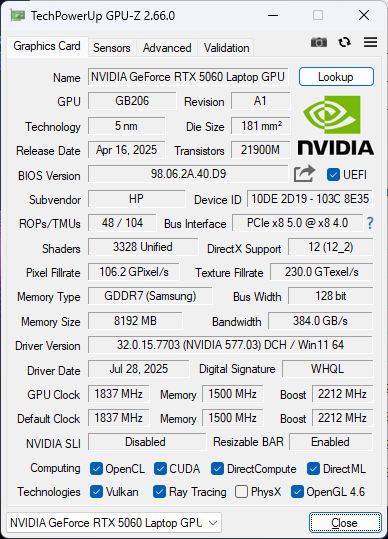 HP Omen 16-ap0091ng GeForce RTX 5060 Laptop, R9 8940HX, Samsung PM9C1b MZVL81T0HFLB-00BH1 | HP Omen 16 (2024) NVIDIA GeForce RTX 4080 Laptop GPU, i9-14900HX, SK hynix PC801 HFS001TEJ9X101N | Lenovo Legion 5 15AHP G10 GeForce RTX 5060 Laptop, R7 260, SK hynix PVC10 HFS001TEM4X182N | SCHENKER XMG Core 15 (M25) GeForce RTX 5060 Laptop, Ryzen AI 7 350, Samsung 990 Pro 2 TB MZVL72T0HDLB | Lenovo LOQ 15AHP10 GeForce RTX 5060 Laptop, R7 250, Micron 2500 1TB MTFDKBA1T0QGN | Alienware 16 Aurora GeForce RTX 5060 Laptop, Core 7 240H | |