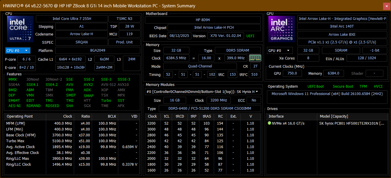 HP ZBook 8 G1i 14 Arc 140T, Ultra 7 255H, SK hynix PC801 HFS001TEJ9X101N | HP ZBook Firefly 14 G11 RTX A500 Laptop GPU, Ultra 7 165H, Kioxia XG8 KXG80ZNV512G | Lenovo ThinkPad P14s Gen 6 21RV0017GE Radeon 890M, Ryzen AI 9 HX PRO 370, SK hynix PC801 HFS001TEJ9X162N | HP ZBook Ultra G1a 14 Radeon 8060S, Ryzen AI Max+ PRO 395, WDC PC SN810 2TB | Dell Precision 5000 5490 NVIDIA RTX 3000 Ada Generation Laptop GPU, Ultra 9 185H, Kioxia XG8 KXG80ZNV1T02 | |