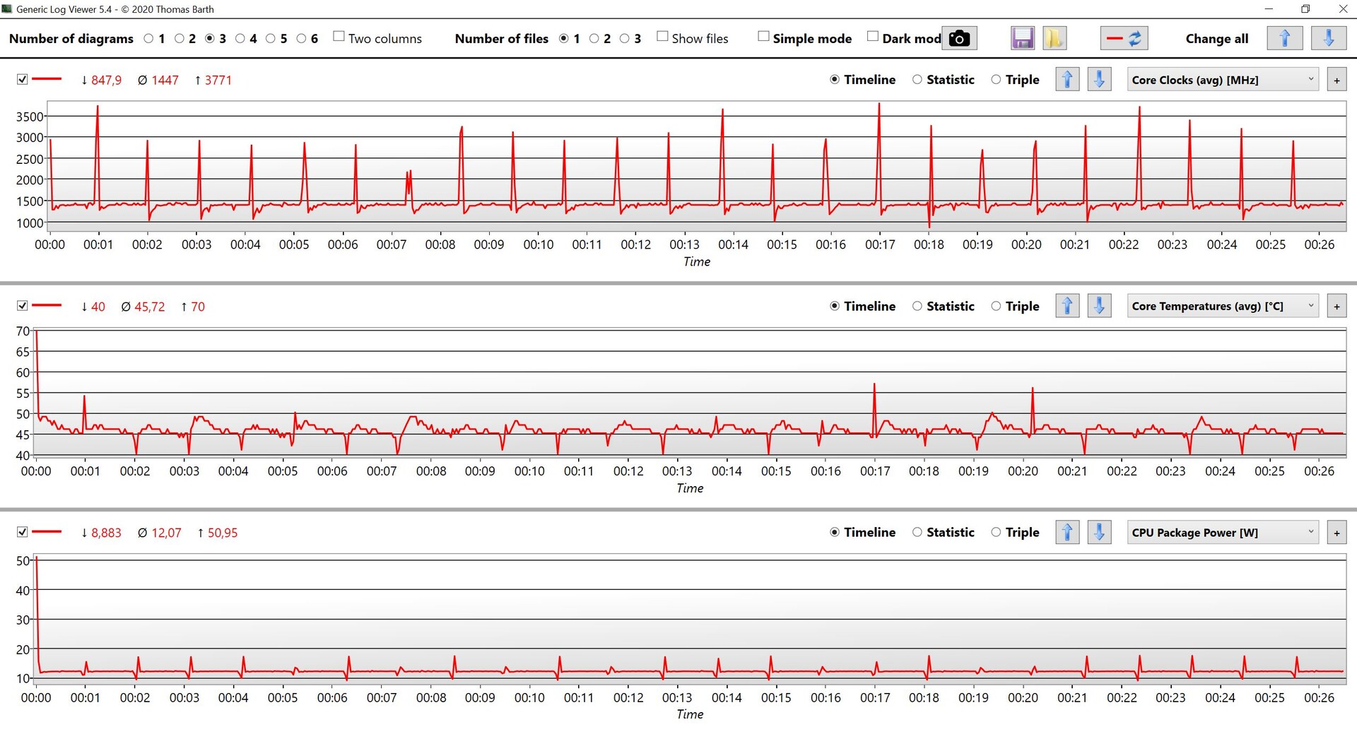 Gli utenti traggono vantaggio dal basso consumo energetico della CPU soprattutto durante l'uso quotidiano, quando la GPU dedicata gira al minimo mentre le superfici metalliche sono solo tiepide, rendendolo adatto a un uso confortevole sulle ginocchia. Tuttavia, se si stressa la GPU si ottengono temperature significativamente più elevate. Sebbene 48 °C (118,4 °F) sul fondo siano ben lontani dall'essere critici, sono abbastanza caldi considerando le scarse prestazioni (potenza totale del sistema di soli 32 watt). Durante lo stress test, il processore scende quasi istantaneamente a 12 watt, mentre la GPU rimane a 20 watt.
