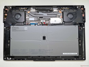 Lenovo fornisce un manuale di manutenzione hardware per il ThinkPad X9 e il coperchio inferiore è fissato da normali viti Philips (attenzione: allentare solo le viti, non rimuoverle con forza). La grande batteria da 80 Wh domina il layout interno, mentre tutti i componenti principali si trovano nella sezione superiore, dove il telaio è più spesso. Sia l'SSD M.2-2242 che la batteria possono essere sostituiti se necessario, ma tutti gli altri componenti sono a bordo.