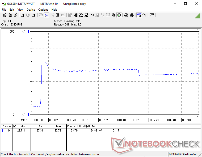 Siamo riusciti a misurare un consumo massimo di 241 W dall'adattatore CA di medie dimensioni (~16,4 x 7,4 x 2,5 cm) da 240 W quando la CPU e la GPU sono utilizzate al 100%. Questa percentuale è solo temporanea, come mostrano gli screenshot qui sotto, a causa del limitato potenziale Turbo Boost della CPU. La batteria può ancora caricarsi a un ritmo decente durante l'esecuzione di carichi elevati come i giochi.