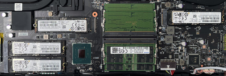 Tutti e quattro gli slot SSD della nostra unità sono occupati da unità PCIe Gen4 NVMe da 1 TB. Sotto il coperchio in alluminio sono presenti quattro stick di memoria DDR5-4800 da 16 GB ciascuno - è possibile inserire fino a 128 GB di memoria DDR5-4800