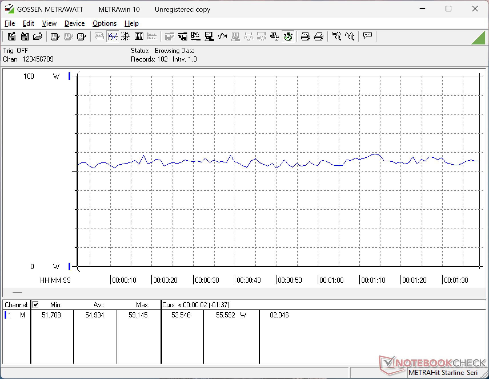 Il consumo complessivo è generalmente superiore a quello di molti altri computer portatili da 16 pollici orientati al budget, in gran parte a causa della CPU più veloce della serie Core-H. Ad esempio, l'esecuzione di Prime95 richiederebbe quasi 70 W, rispetto ai soli 40 W della CPU Lunar Lake-V Dell 16 Plus.