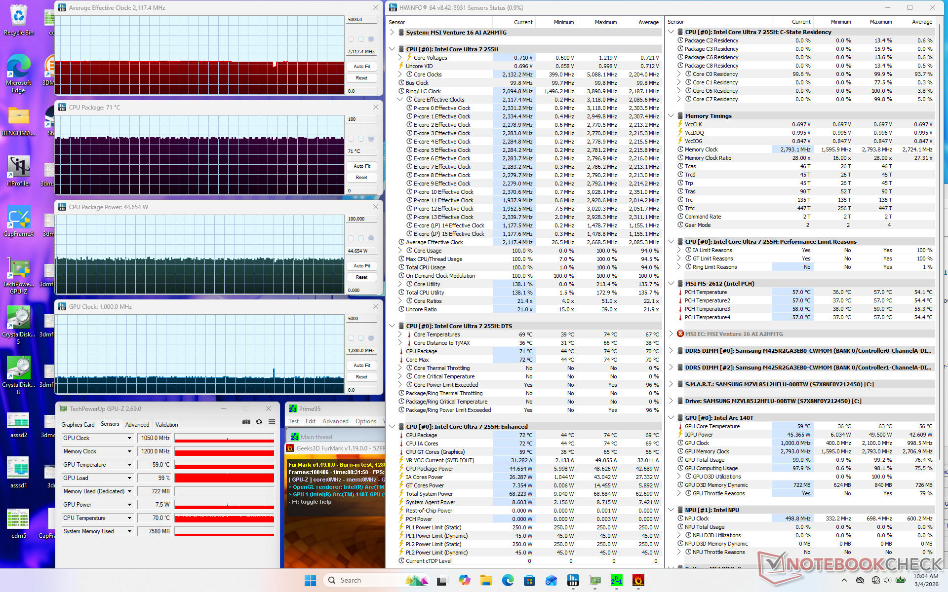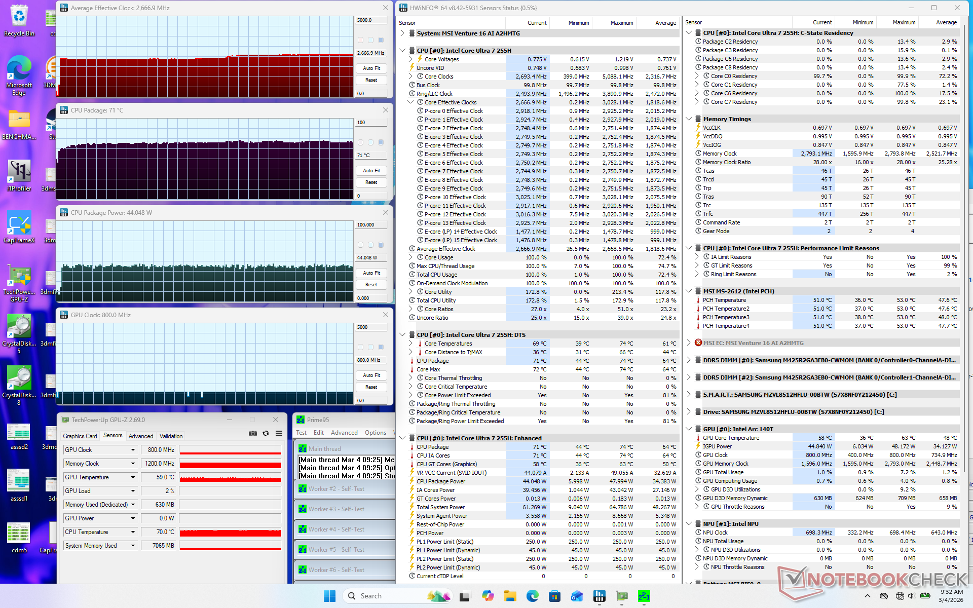 La CPU si stabilizzava a 2,7 GHz, 71 C e 44 W quando si avviava lo stress Prime95. La temperatura del core rimaneva nella fascia bassa di 70 C anche quando era sotto stress, rispetto alla fascia media di 80 C del Prestige 16 dotato di una CPU Core serie H simile.