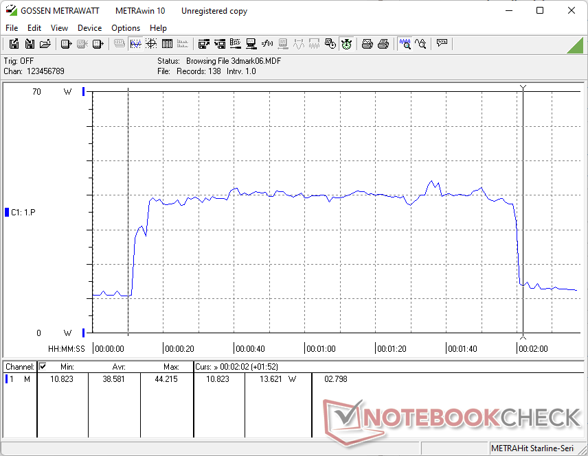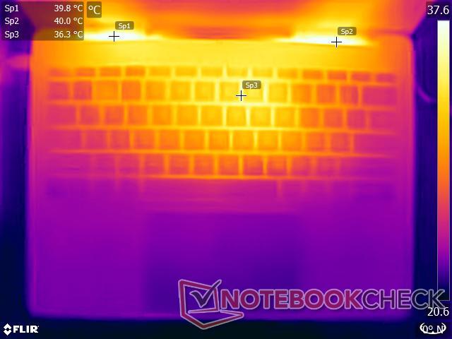 Sotto stress, le temperature massime si vedono verso le parti in alto a sinistra e in basso a sinistra delle unità. Le temperature intorno al ponte della tastiera sono tollerabili per la maggior parte, mentre il touchpad e le aree di appoggio dei polsi rimangono relativamente fresche. L'alimentatore, comunque, raggiunge quasi 50 °C sotto stress.