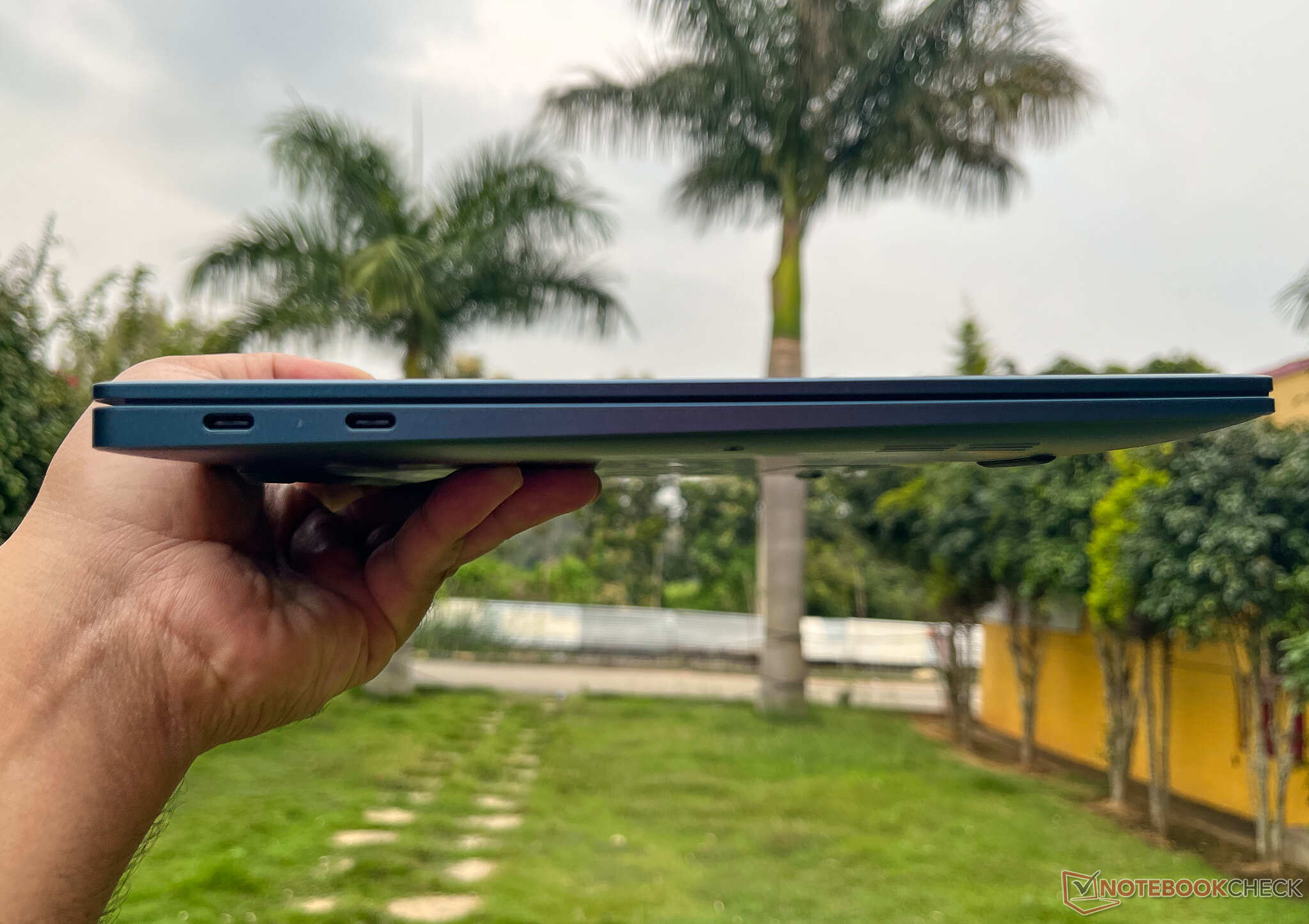 Il Realme Book (Slim) offre una selezione di porte molto scarna con solo due porte USB 3.2 Gen2 Type-C sulla sinistra e una porta USB 3.1 Gen1 Type-A insieme a un jack audio combo da 3,5 mm sulla destra. Coloro che optano per la variante Core i5 hanno la possibilità di ottenere la funzionalità Thunderbolt 4 in una delle porte Type-C.