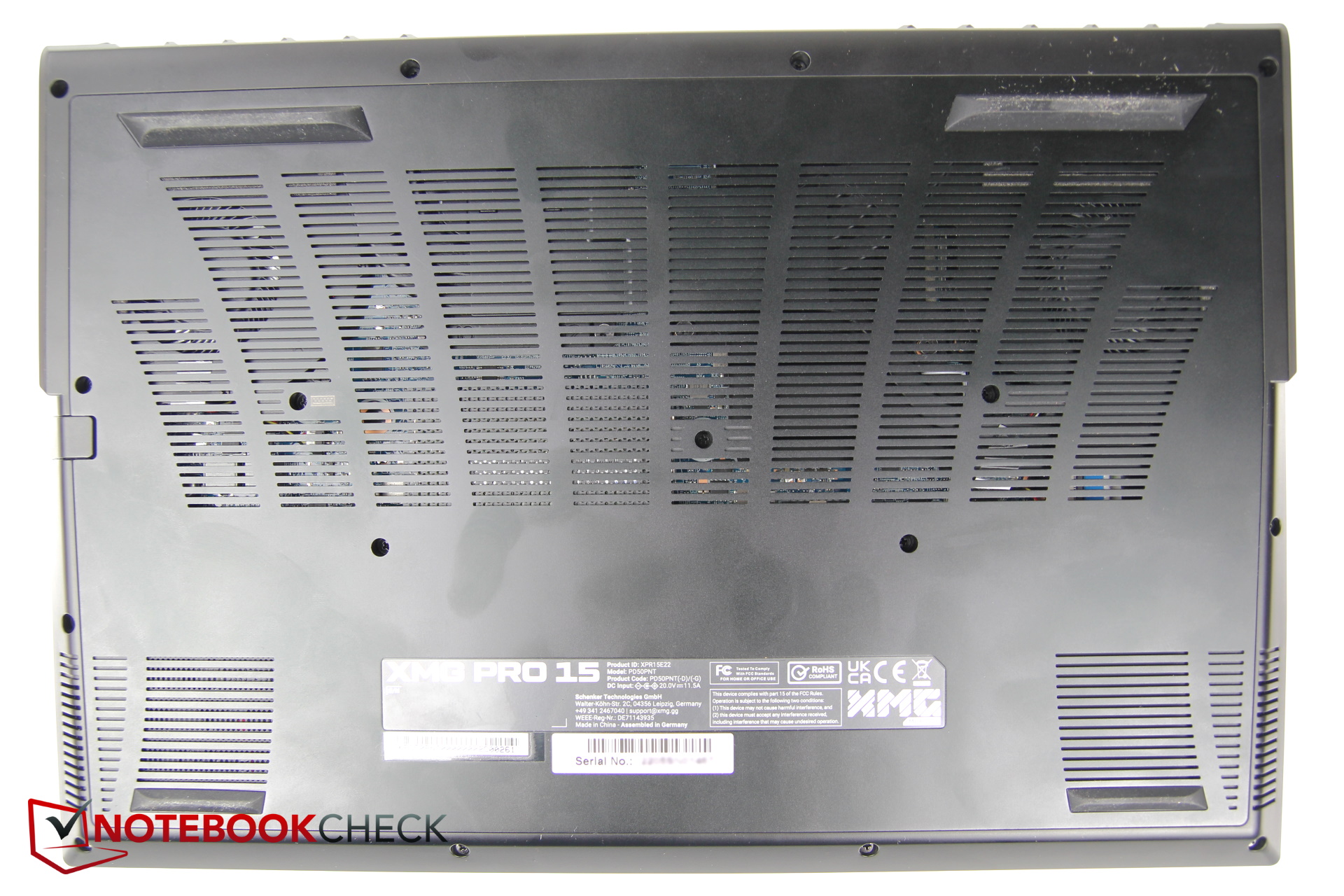 Schenker utilizza una nuova custodia, la Clevo PD50PNT. Il coperchio del display e il guscio inferiore sono ancora in alluminio, mentre la cornice del display e il guscio superiore sono in plastica. Il coperchio del display e la base emettono leggeri scricchiolii durante la torsione, ma danno comunque l'impressione di essere sufficientemente robusti, soprattutto la base. Non sono state riscontrate fessure irregolari e la lavorazione è di buon livello.