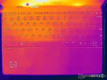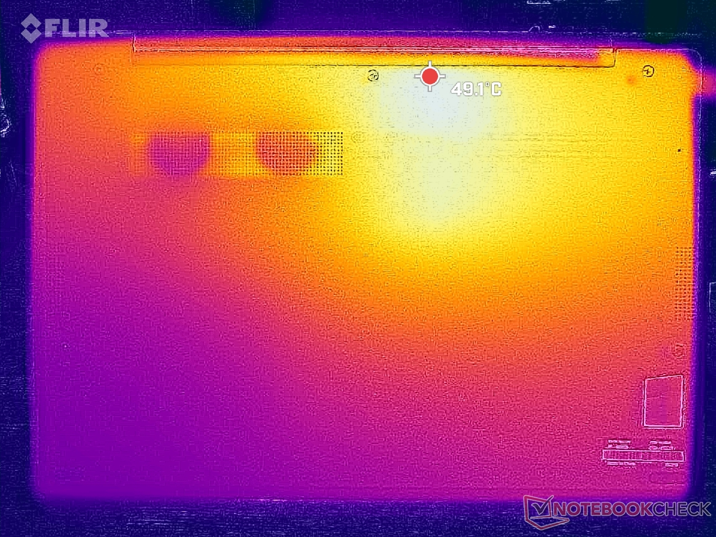 Le temperature di superficie possono essere molto calde quando si eseguono carichi impegnativi, a causa del design compatto e dello chassis in metallo. I punti caldi possono raggiungere oltre 46 C e 48 C sul centro della tastiera e sul lato inferiore, rispettivamente, rispetto ai soli 39 C-41 C del modello HP Dragonfly G4 HP Dragonfly G4 con il Core i7-1365U più lento.