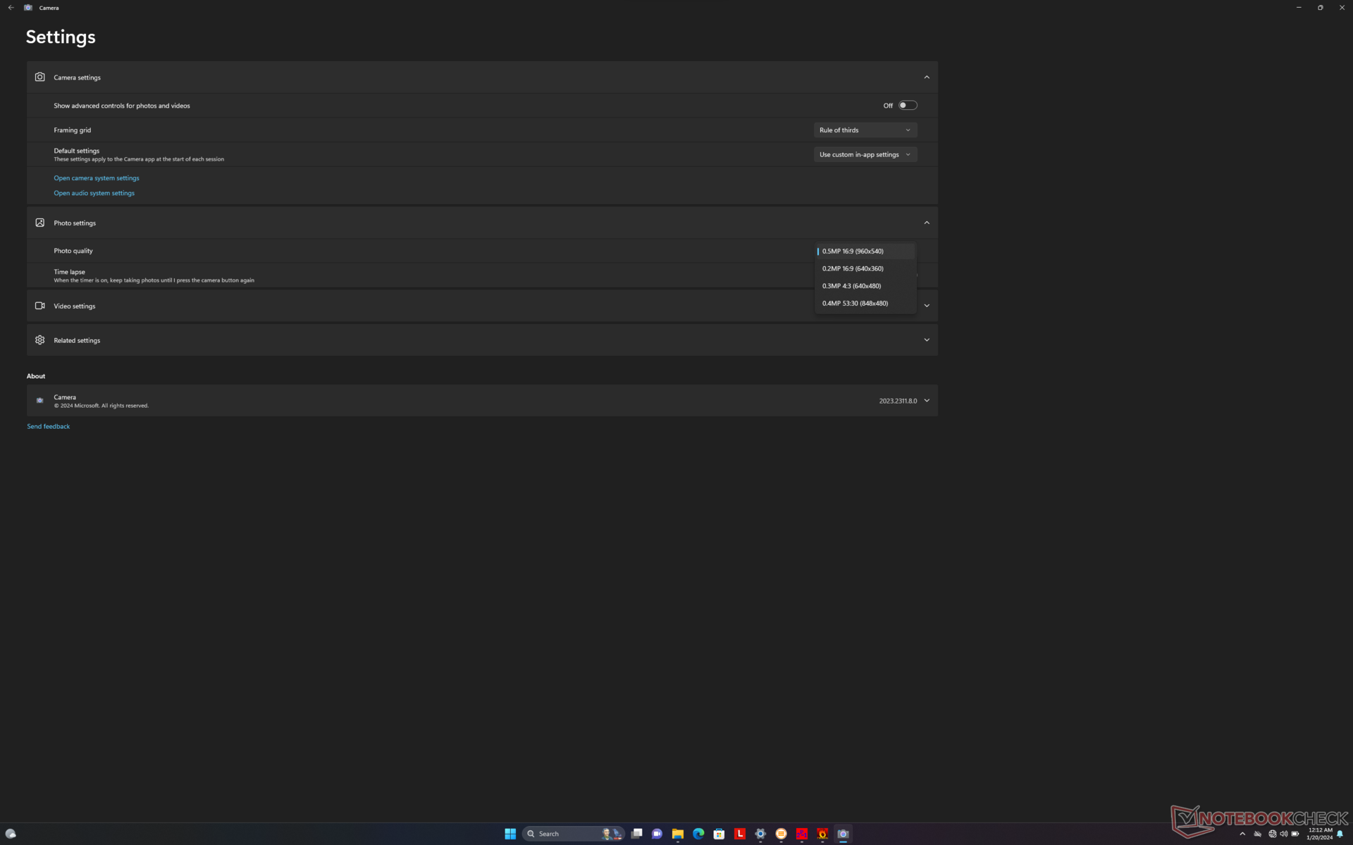 Sebbene il modello Lenovo sia dotato di una webcam da 2 MP, l'app fotocamera di Windows può selezionare solo fino a 0,5 MP, come mostra lo screenshot a destra. Abbiamo riscontrato un problema simile sul recente HP Pavilion Plus 14 che era anch'esso alimentato da una CPU AMD Zen 4.
