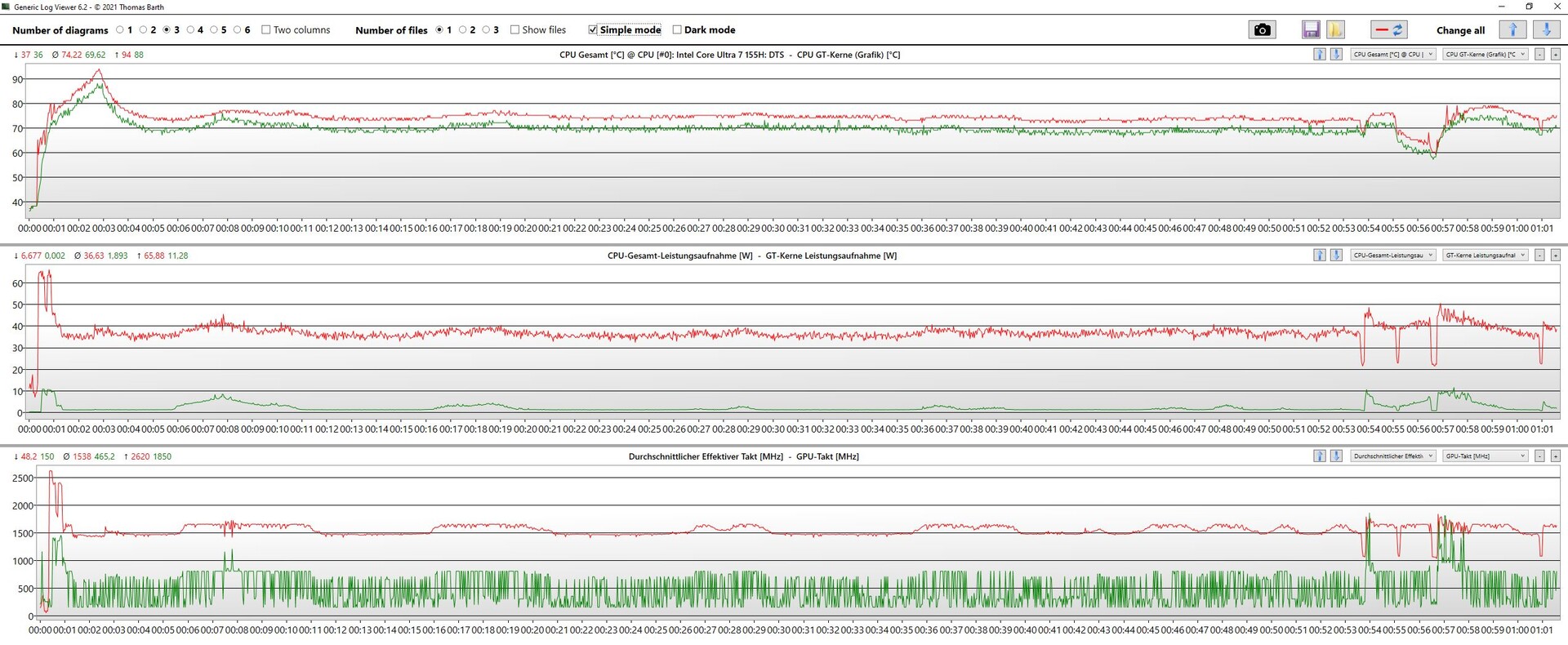 Durante il test di stress, i core della CPU hanno brevemente raggiunto i 2,6 GHz. Si sono riscaldati fino a 94 °C, dopodiché sono stati strozzati. La frequenza di clock si è stabilizzata a circa 1,5 GHz e il consumo energetico è sceso da 65 watt a circa 37 watt.