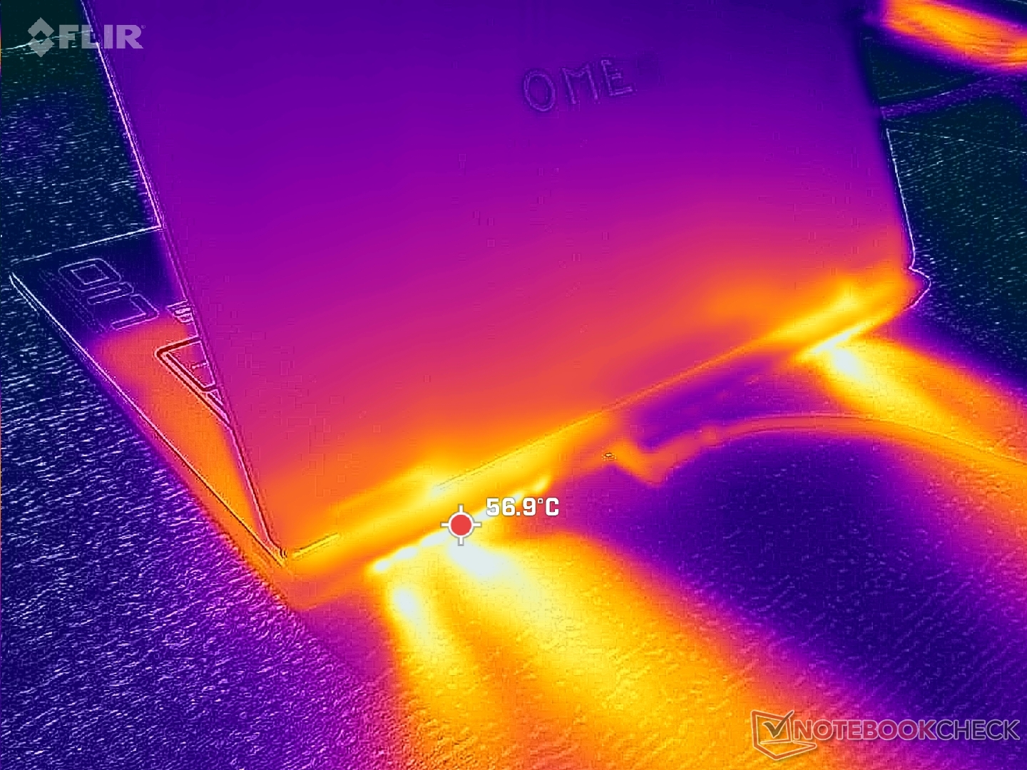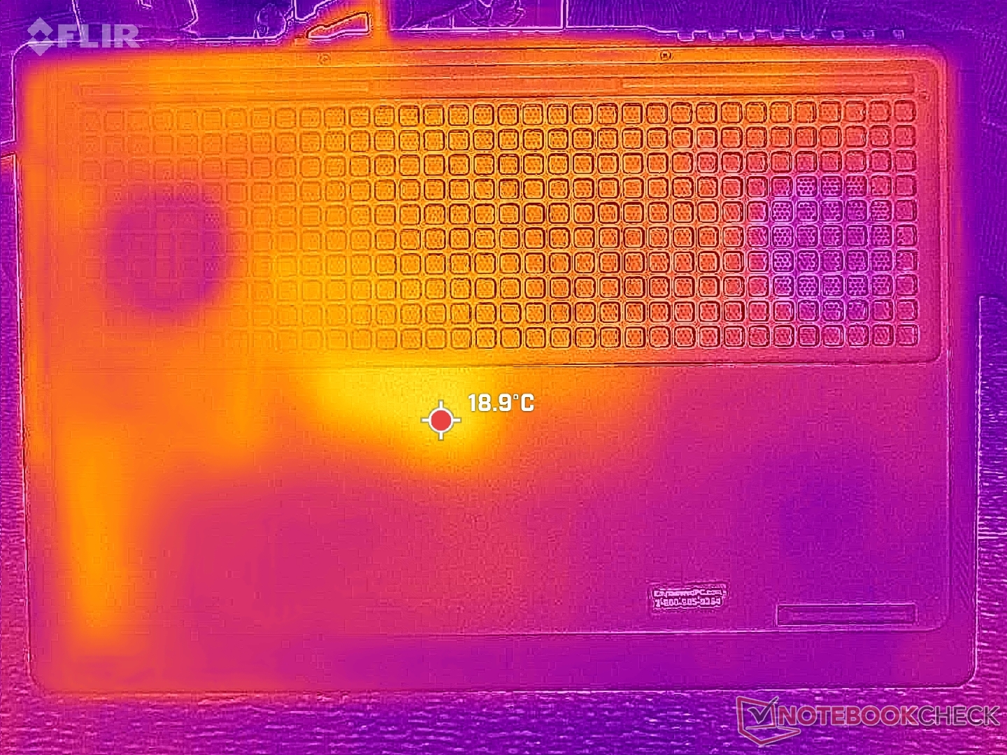 Le temperature medie della superficie sono di diversi gradi C più fresche rispetto a quelle che abbiamo riscontrato sul concorrente Lenovo LOQ 17IRX10 dove i punti caldi possono raggiungere oltre 45 C in condizioni simili.