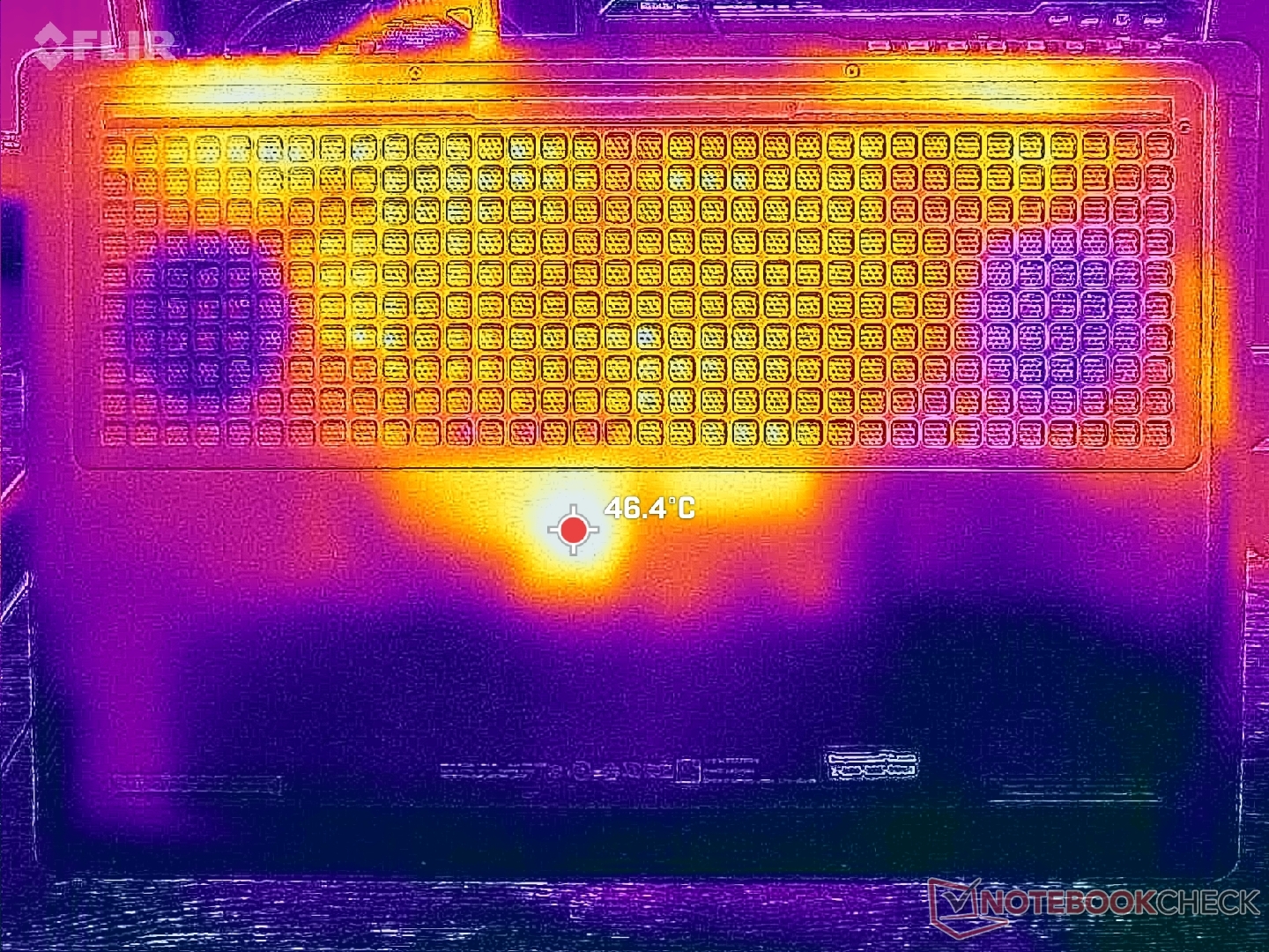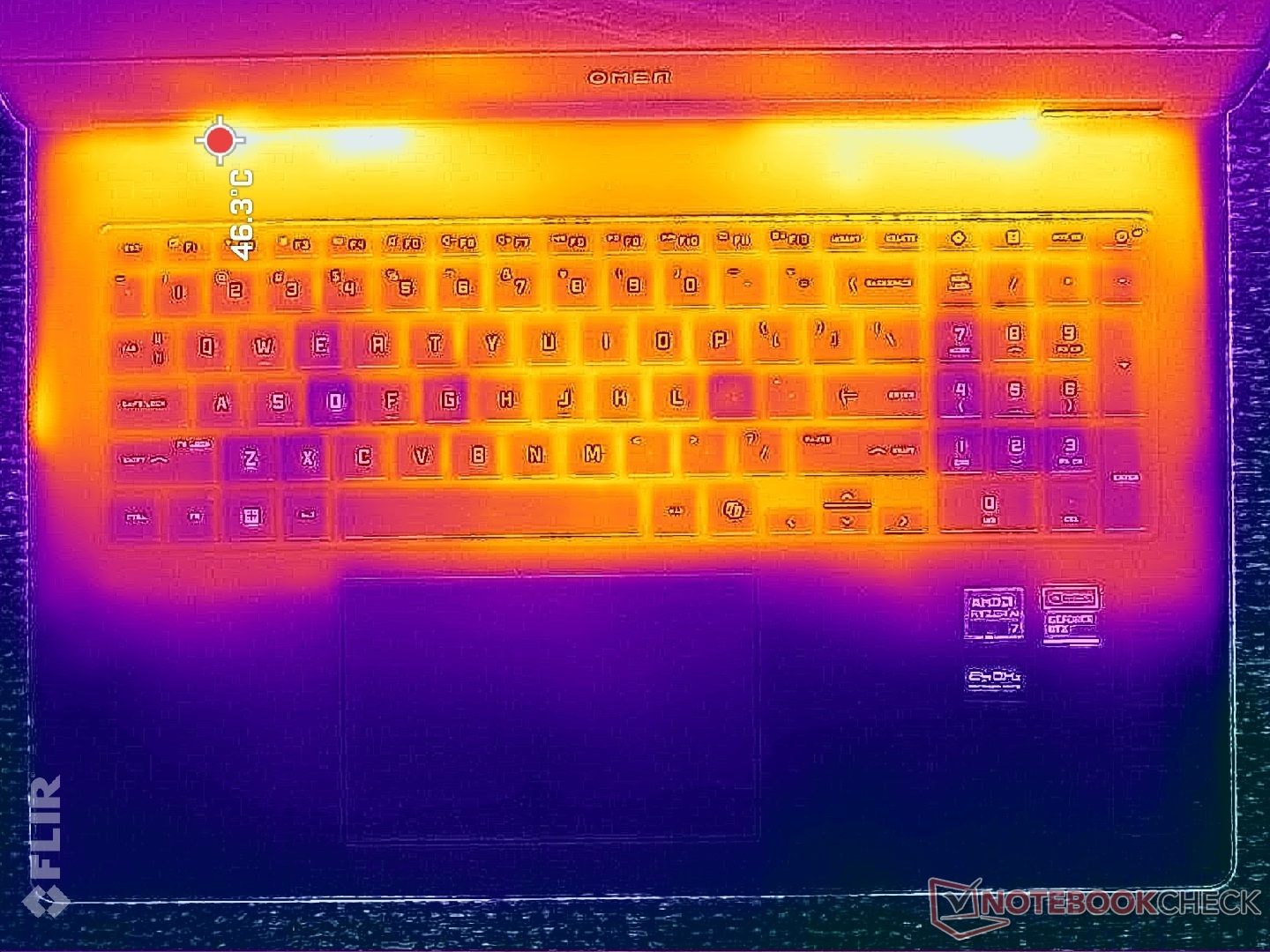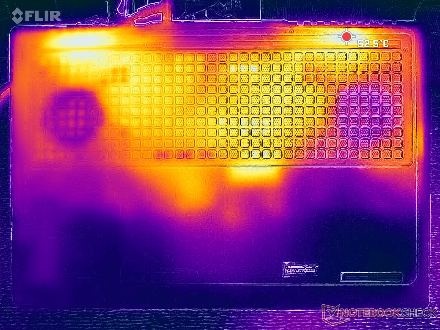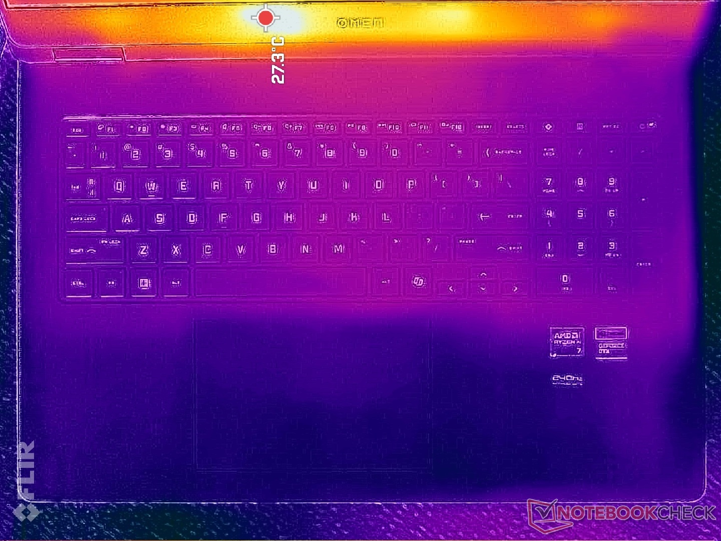 Le temperature della superficie sono più calde verso il centro della tastiera, dove i punti caldi possono raggiungere quasi 40 C durante il gioco. Fortunatamente, i tasti WASD, il tastierino numerico e i poggiapolsi rimangono molto più freschi.