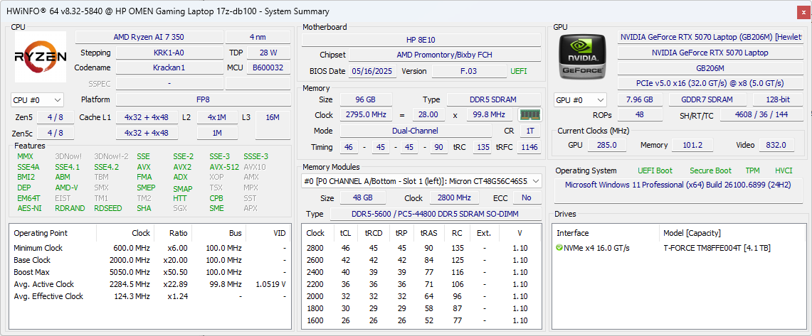 | HP Omen 17z-db100 AMD Ryzen AI 7 350 ⎘ NVIDIA GeForce RTX 5070 Laptop ⎘ 96 GB Memoria | Amazon: $1,989.00 Prezzo di listino: 1550 USD | 2.9 kg | 30.1 mm | 17.30" 2560x1440 170 PPI IPS | |