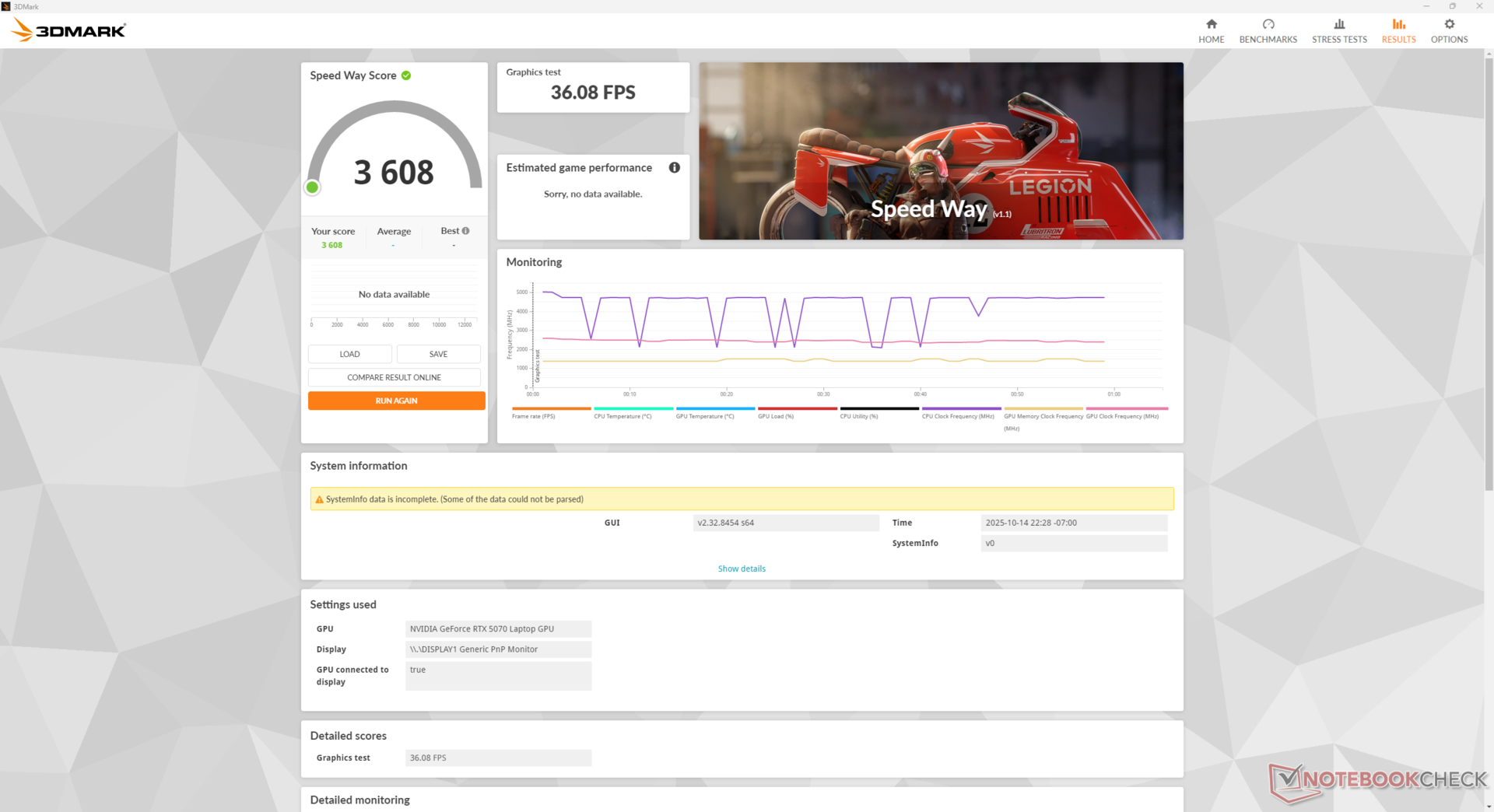 I livelli di consumo medio sotto carico sono generalmente inferiori a quelli che abbiamo registrato sul modello dell'anno scorso, anche se il nostro modello più recente offre prestazioni più veloci. Quando si esegue Cyberpunk 2077, ad esempio, il nostro Omen 17 del 2025 richiede circa il 12% di energia in meno, pur funzionando il 17% più velocemente per migliorare le prestazioni per watt. I vantaggi in termini di frame rate possono essere ancora maggiori se si utilizza la generazione multi-frame, poiché questa funzione non è disponibile sulle GPU della serie RTX 40 di GeForce.
