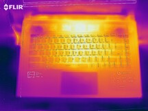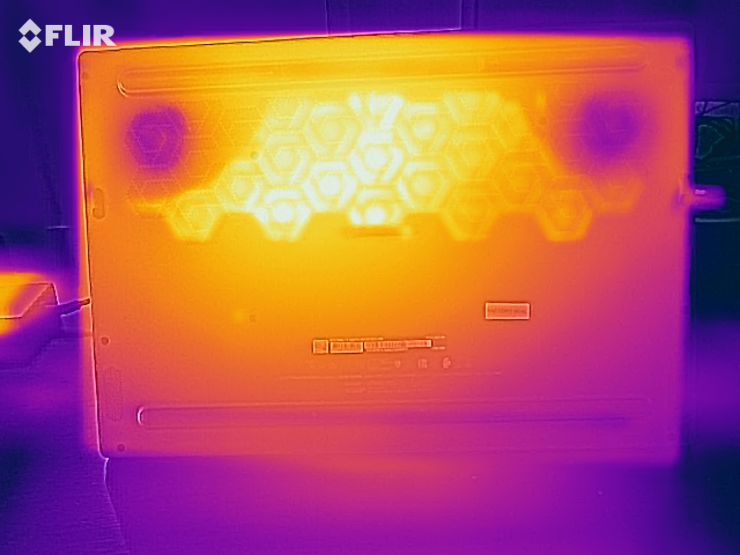 Rispetto alla concorrenza, anche lo sviluppo della temperatura è nella media. Lo chassis si è riscaldato fino a 50 °C (~122 °F) (in alto) e 55 °C (~131 °F) (in basso), rispettivamente, nello stress test con gli strumenti FurMark e Prime95. I risultati sono stati simili nel nostro test su Witcher 3. Di conseguenza, non dovreste mettere il dispositivo sulle vostre ginocchia quando giocate, se possibile. L'intero chassis rimane piacevolmente fresco nell'uso inattivo. Gran parte delle superfici rimane sotto i 30 °C (~86 °F).