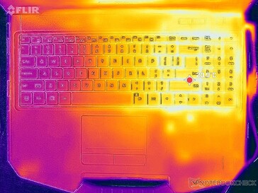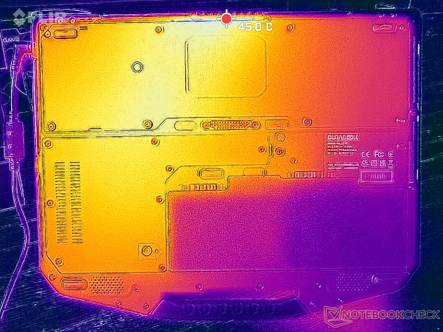 La metà destra del sistema sarà sempre più calda di quella sinistra, a causa del posizionamento della batteria e della soluzione di raffreddamento. I punti caldi sul fondo possono raggiungere poco più di 40 C, come nel caso dei modelli più spessi e più pesanti Panasonic Toughbook 40 o al vecchio Durabook S15ABG2.