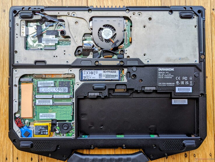 Visivamente, sono state apportate alcune modifiche allo chassis, tra cui il nuovo colore nero uniforme, la tastiera più grande con tastierino numerico, la transizione della superficie più liscia tra il piano della tastiera e la maniglia di trasporto e il posizionamento rivisto delle porte a causa di tutte le modifiche interne alla scheda madre. La qualità dello chassis rimane eccellente come in precedenza, tranne che per la parte della tastiera con il tastierino numerico, dove la superficie tende a deformarsi molto più facilmente quando si esercita una pressione. Troviamo che il Getac S410, più spesso, sia più robusto, soprattutto negli angoli, dato che il Durabook non è gommato per una migliore protezione dalle cadute.