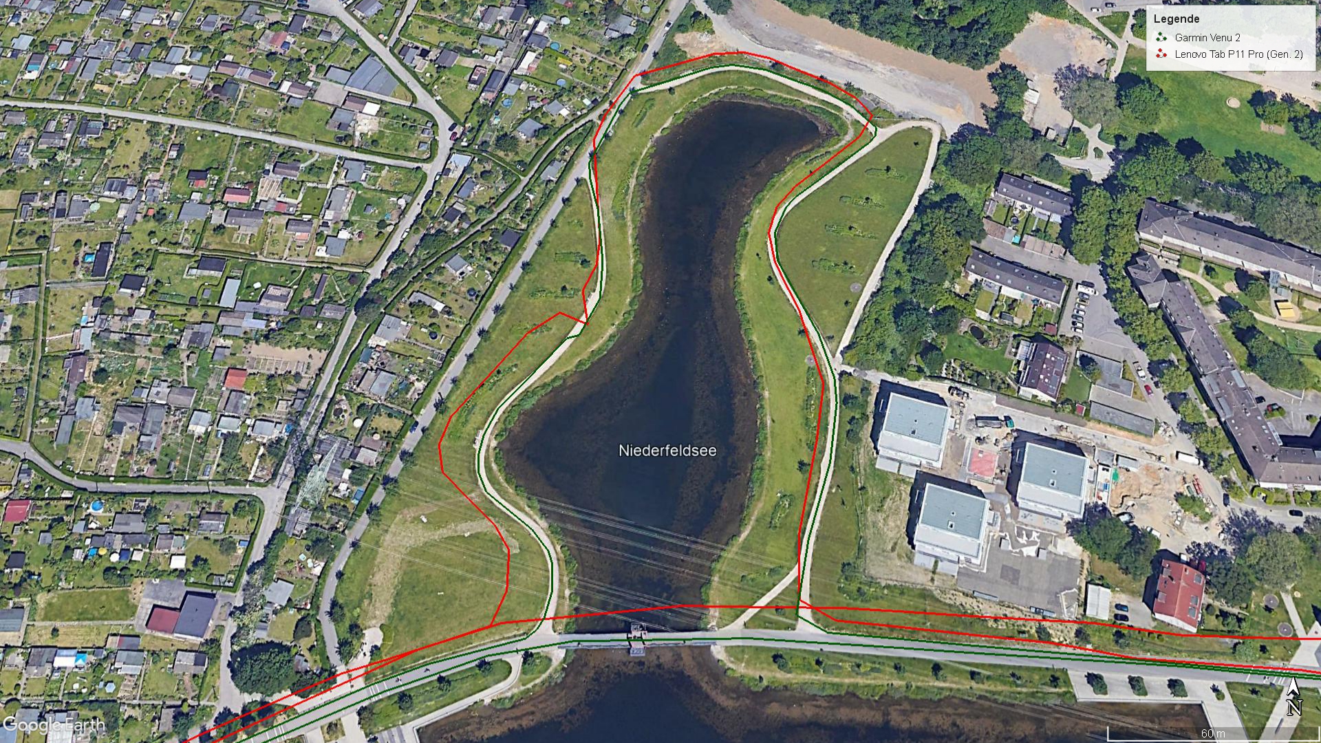 Tuttavia, la precisione del GPS non è altrettanto elevata nell'uso pratico, come dimostra il nostro breve giro in bicicletta. Il Tab P11 Pro Gen 2 a volte registra il percorso di quasi 10 chilometri in modo molto meno preciso rispetto al fitness tracker Garmin Venu 2. A volte il GPS ci ha posizionato all'interno di una casa. A volte il GPS ci ha posizionato sul muro di casa invece che sulla strada, e a volte abbiamo attraversato il lago invece che il ponte. Tuttavia, il livello di precisione è ancora sufficiente per la navigazione quotidiana con Google Maps & Co