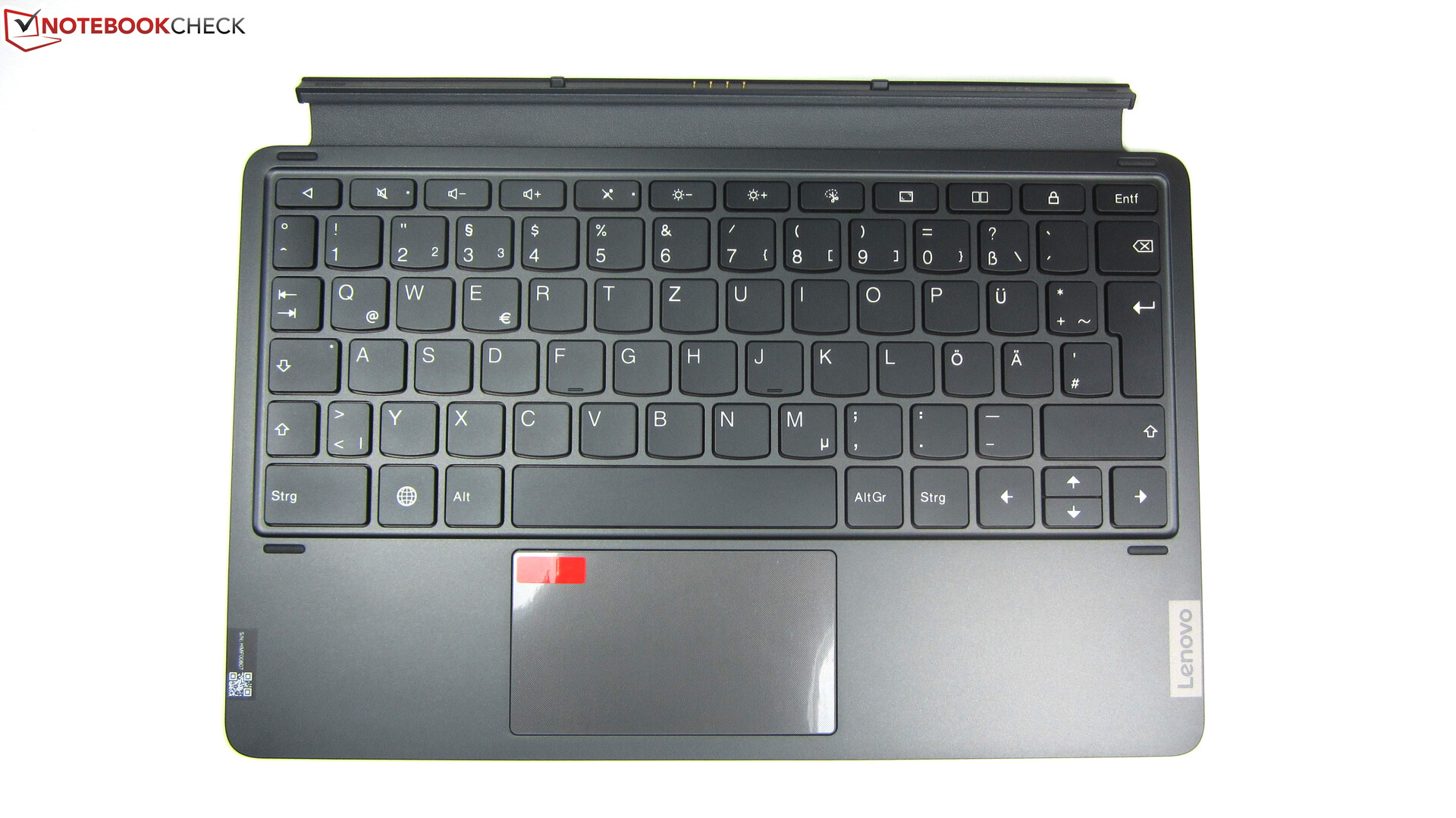 La superficie gommata della tastiera protegge il tablet e si aggancia al suo lato inferiore tramite 4 pogo pin. Il retro della cover può essere angolato per una maggiore facilità d'uso, consentendo di aprire il tablet fino a un angolo massimo di circa 135°