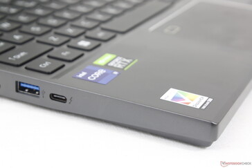 Le opzioni per le porte sono più limitate rispetto all'Asus Zephyrus G14 o al Razer Blade 14, poiché ogni alternativa integra una porta USB-C in più rispetto all'Acer. Anche il posizionamento delle porte è un po' sfavorevole, perché le porte sono strette e relativamente vicine al bordo anteriore. È chiaro che le grandi griglie di ventilazione che circondano lo chassis sottraggono spazio prezioso alle porte.